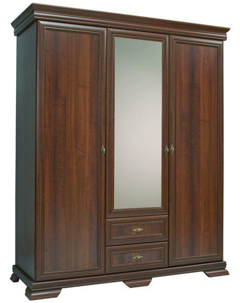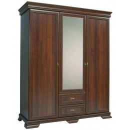 Šatní skříň kombinovaná K S2 ze systému KORA - třídveřová se zrcadlem. Uprostřed jsou police a dva šuplíky. Po stranách šatní tyče. Prostřední dveře mají zrcadlo.