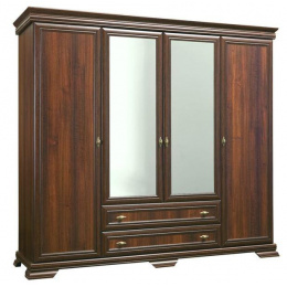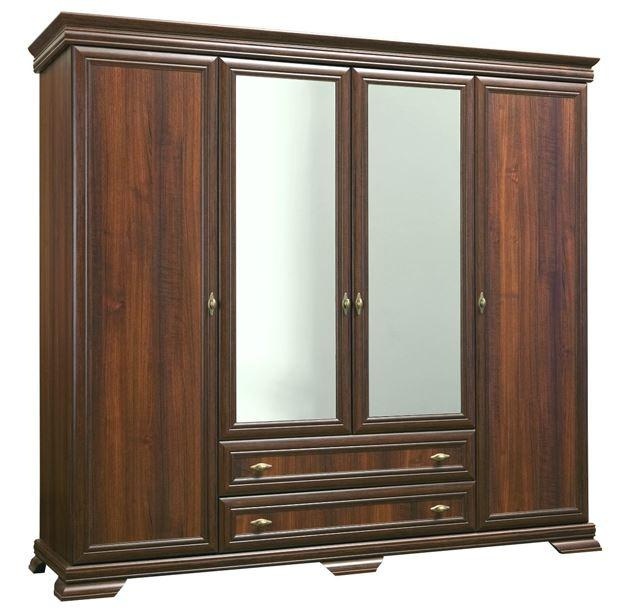Šatní skříň kombinovaná K S3 ze systému KORA - čtyřdveřová se zrcadlem, uprostřed šatní tyč a dva šuplíky. Po stranách police. Prostřední dvou dveře mají zrcadlo.