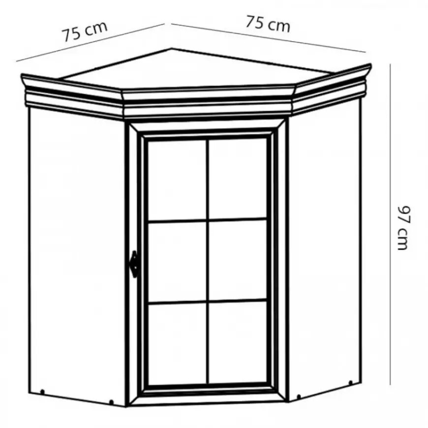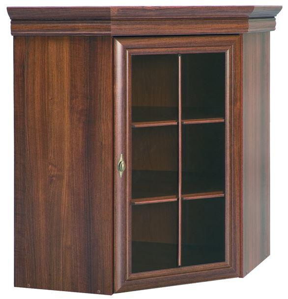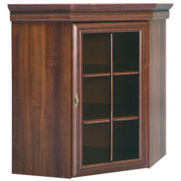 Vitrína K NN1 ze systému KORA - rohová s prosklenými dvířky a dvěmi policemi, slouží jako nadstavba k rohové komodě K KN1.