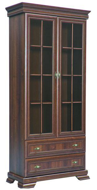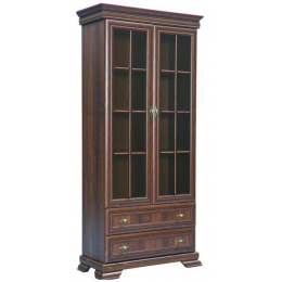 Vitrína K RW2 ze systému KORA - vitrína je policová s prosklenými dvířky a dvěma šuplíky ve spodní části.
