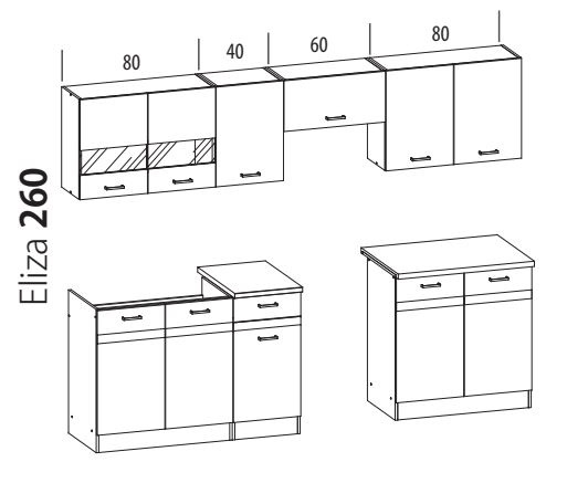 Kuchyňskou linku ELIZA si můžete doplnit o další skříňky, popř. si ji sestavit podle svých rozměrů a požadavků - na dotaz u prodejce.