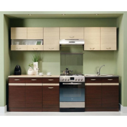 Kuchyňská linka Eliza 260 je kuchyňský komplet v celkové délce 260 cm. Korpus kuchyně je vyroben z laminotřískové desky v barvě dub wenge. Stejně tak i dvířka skříněk jsou vyrobena z kvalitní laminotřískové desky. Tato kuchyňská linka má horní dvířka v barvě rijeka světlá a spodní dvířka v kombinaci dub wenge / rijeka světlá.