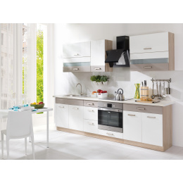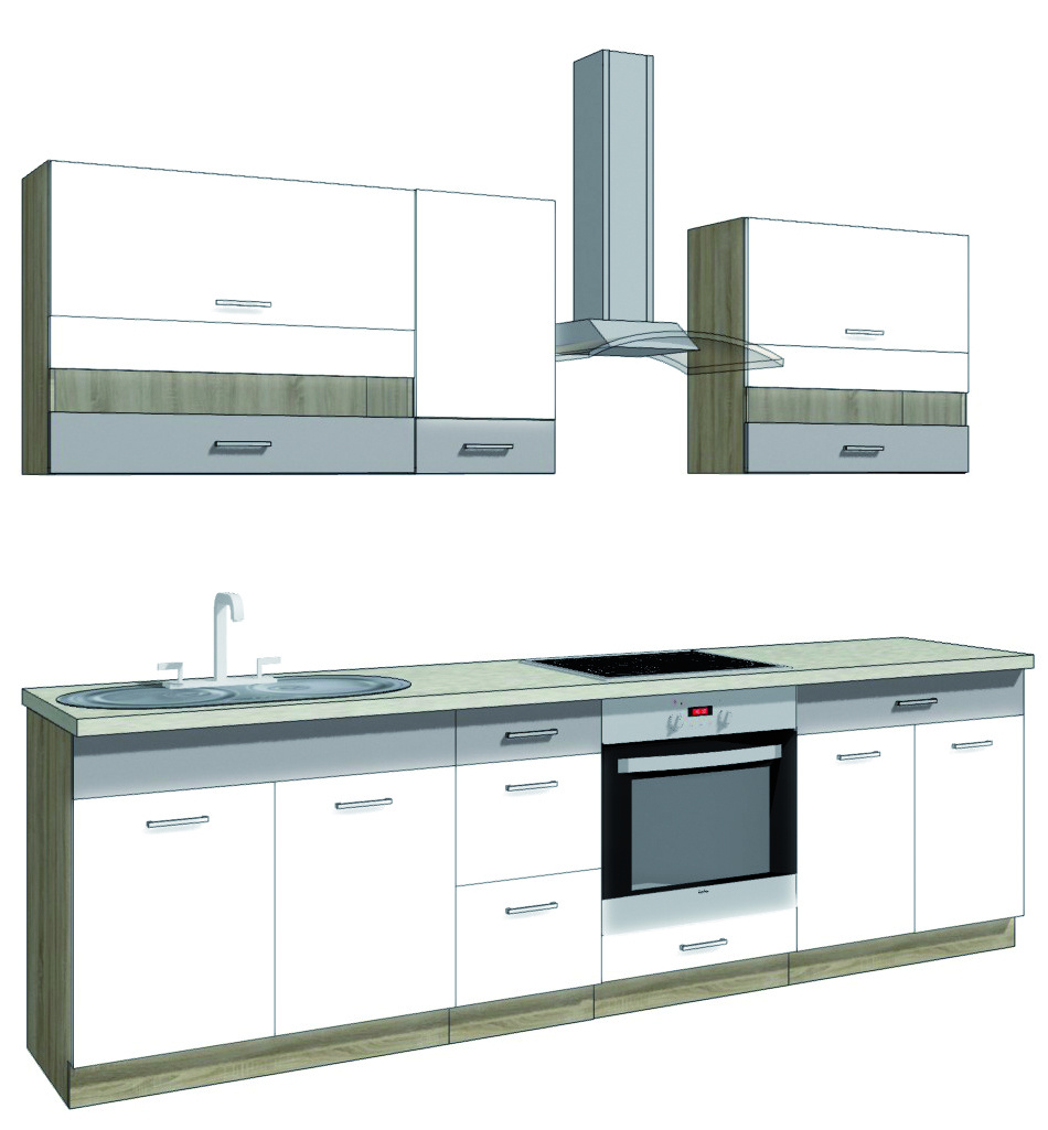 Kuchyňská linka EVA, sestava 270 cm. Koupě celé sestavy je ekonomičtější než pořízení jednotlivých dílů. Součástí sestavy jsou skříňky, bez kterých se žádná kuchyňská linka neobejde. Kuchyňská linka EVA je vyrobena z kvalitního lamina. Zásuvky u spodních dvířek jsou opatřeny kvalitními pojezdy GTV Metalbox. Dvířka skříňek mají tzv. tiché zavíraní (GTV). Kuchyň má kovové úchyty. Pokud chcete kuchyň sestavit dle vlastních rozměrů - rádi Vám poradíme, kontaktujte nás.