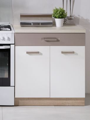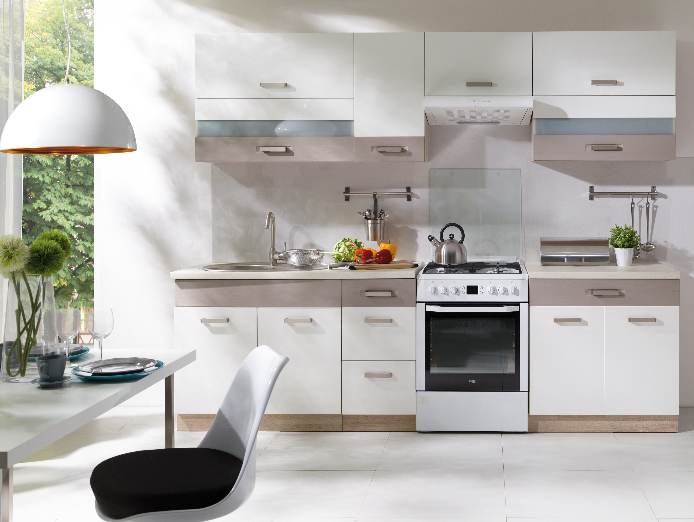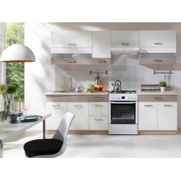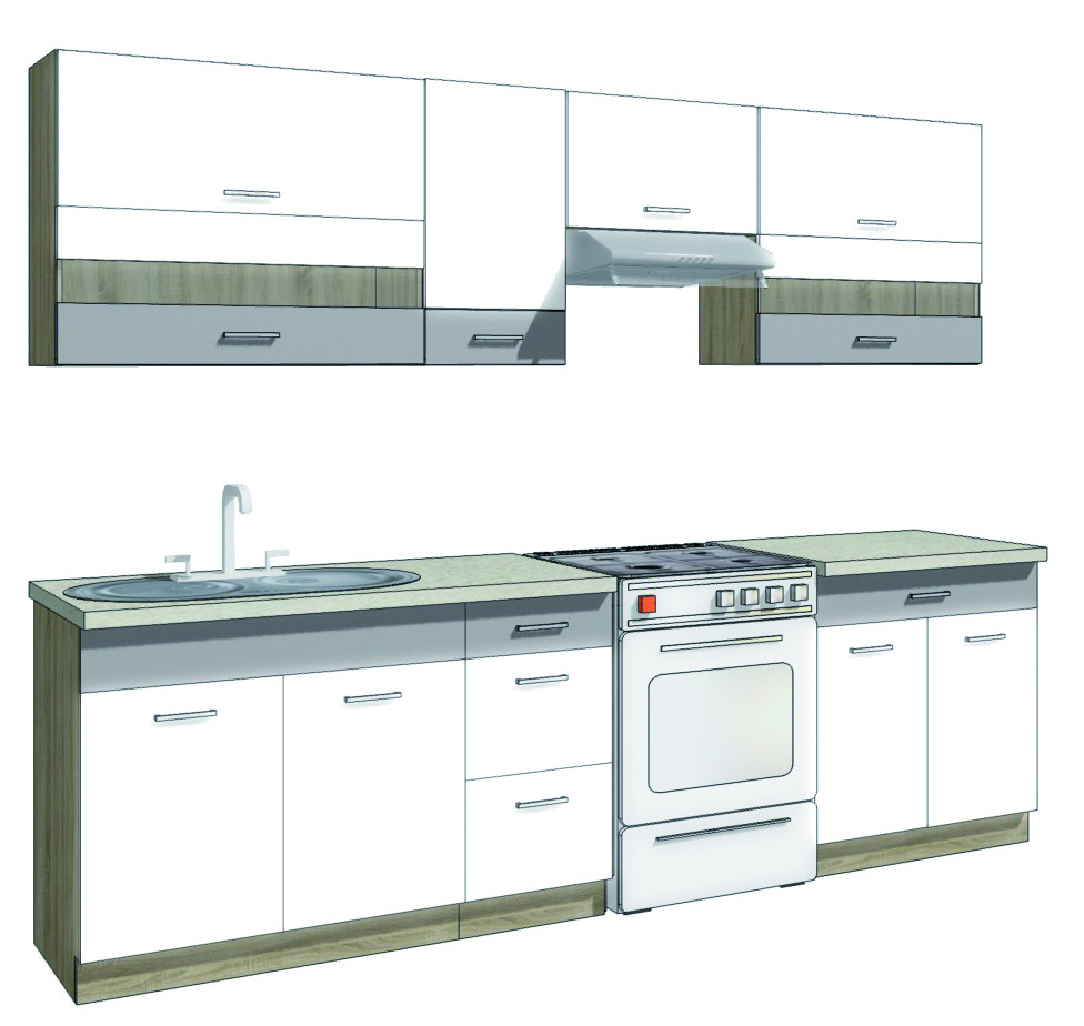 Kuchyňská linka EVA, sestava 270cm. Koupě celé sestavy je ekonomičtější než pořízení jednotlivých dílů. Součástí sestavy jsou skříňky, bez kterých se žádná kuchyňská linka neobejde. Kuchyňská linka EVA je vyrobena z kvalitního lamina. Zásuvky u spodních dvířek jsou opatřeny kvalitními pojezdy GTV Metalbox. Dvířka skříňek mají tzv. tiché zavíraní (GTV). Kuchyň má kovové úchyty. Pokud chcete kuchyň sestavit dle vlastních rozměrů - rádi Vám poradíme, kontaktujte nás.