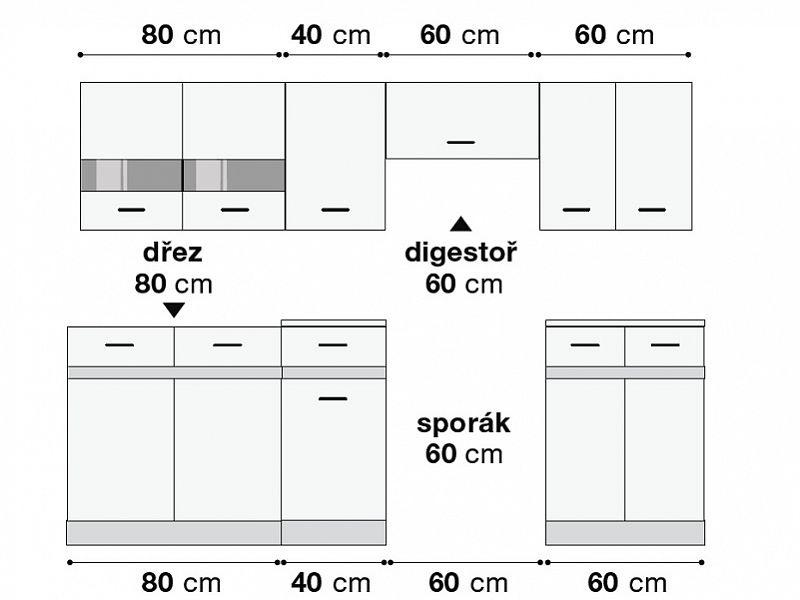 Šířky skříněk v dané sestavě: 2x 40cm, 2x 80cm, 2x 60cm, 1x 60cm digestořová skříňka
