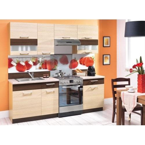 Kuchyňská linka MODENA 220 v kvalitním provedením a hlavně vynikající cenou. Vyrobena je z kvalitního lamina. Korpusy jsou olepeny ABS hranami 0,5 mm, dvířka Tafla velice odolnou ABS hranou tloušťky 2 mm a jsou doplněna kovovými úchytkami. Dodávána je i s pracovní deskou v barvě Travertyn světlý o výšce 38 mm, která je dodávána ve dvou kusech 100 cm a 60 cm. Barevné provedení je v moderní kombinaci Rijeka světlá, která je použita na korpusy i dvířka. Dvířka jsou doplněna pruhem z Rijeky tmavé. Kuchyně má kovové úchytky moderního tvaru.