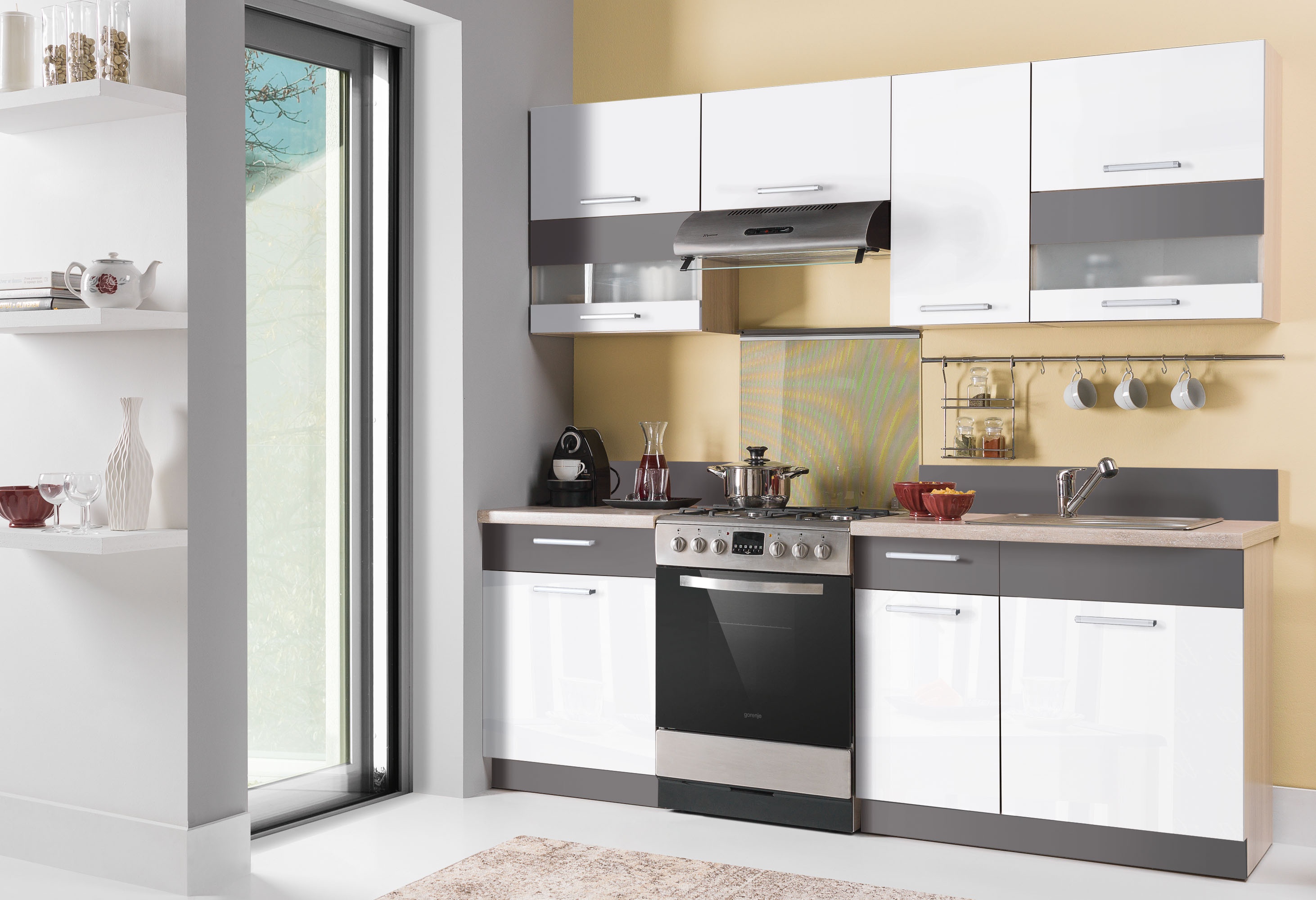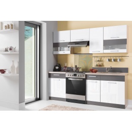 Kuchyňská linka MODENA 220 se vyznačuje kvalitním provedením a vynikající cenou. Vyrobena je z kvalitního lamina a MDF desky (dvířka). Korpusy jsou olepeny ABS hranami 0,5 mm, dvířka mají zaoblené hrany a dekor dvířek tvoří kvalitní fólie v moderním lesklém provedení a jsou doplněna kovovými úchytkami. Dodávána je i s pracovní deskou v barvě Travertyn světlý o výšce 38 mm, která je dodávána ve dvou kusech 100 cm a 60 cm. Dvířka jsou v barvě bílý lesk a doplněna pruhem Grafit mat. Korpus je v odstínu rijeka světlá.