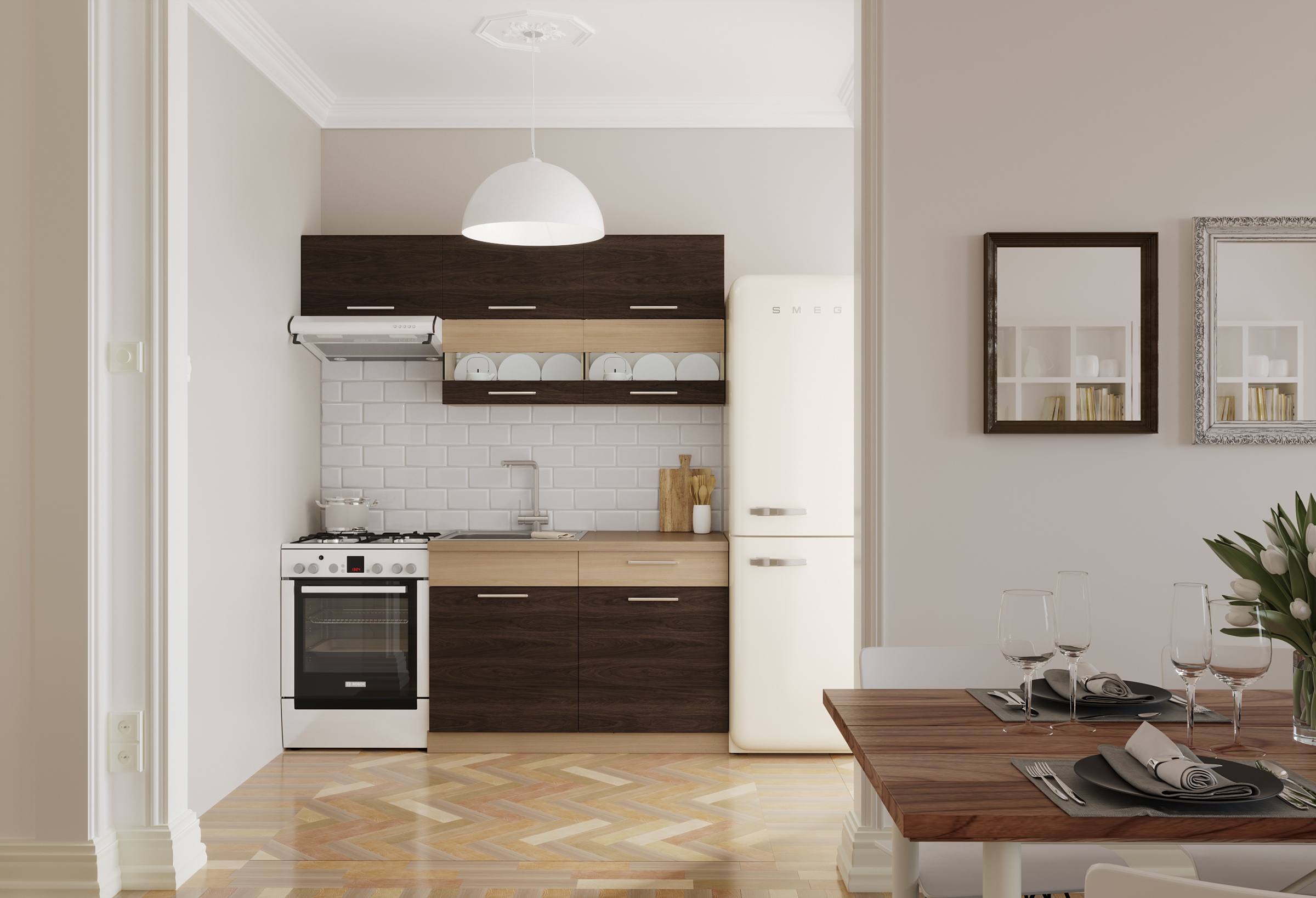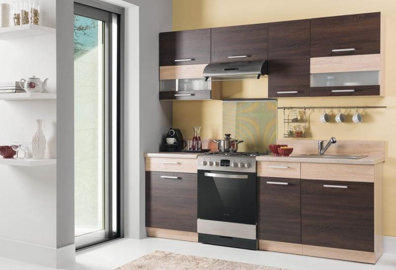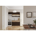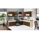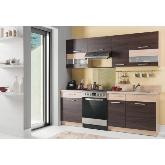 Kuchyňská linka MODENA 220 se vyznačuje kvalitním provedením a vynikající cenou. Vyrobena je z kvalitního lamina. Korpusy jsou olepeny ABS hranami 0,5 mm, dvířka Tafla velice odolnou ABS hranou tloušťky 2 mm a jsou doplněna kovovými úchytkami. Dodávána je i s pracovní deskou v barvě Travertyn světlý o výšce 38 mm, která je dodávána ve dvou kusech 100 cm a 60 cm. Barevné provedení je v moderní kombinaci Rijeka tmavá. Dvířka jsou doplněna pruhem z Rijeky světlé. Korpus je v odstínu rijeka světlá. Kuchyně má kovové úchytky moderního tvaru.