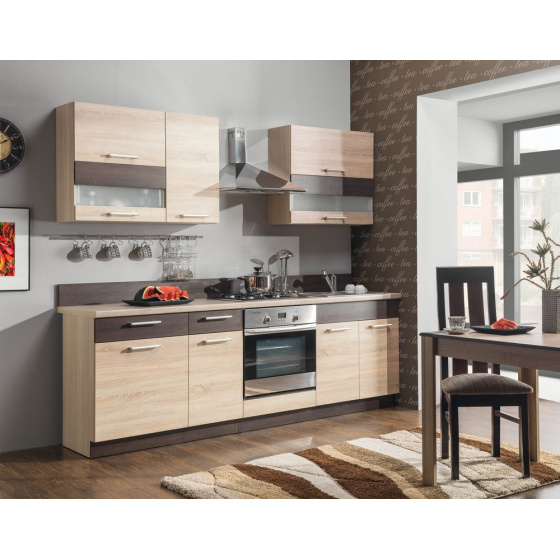 Kuchyňská linka MODENA 240 se vyznačuje moderním vzhledem, kvalitním provedením a hlavně vynikající cenou. Vyrobena je z kvalitního lamina. Korpusy jsou olepeny ABS hranami 0,5 mm, Dvířka Tafla velice odolnou ABS hranou tloušťky 2 mm a jsou doplněna kovovými úchytkami. Dodávána je i s pracovní deskou v barvě Travertyn světlý o výšce 38 mm, která je v jednom kuse délky 240 cm. Korpus je v odstínu rieka světlá. Dvířka v odstínu rieka světlá / rieka tmavá. Kuchyň má kovové úchytky moderního tvaru.