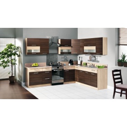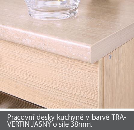 Kuchyňská linka MODENA rohová se vyznačuje kvalitním provedením a vynikající cenou. Vyrobena je z kvalitního lamina. Korpusy jsou olepeny ABS hranami 0,5 mm, dvířka Tafla velice odolnou ABS hranou tloušťky 2 mm a jsou doplněna kovovými úchytkami. Dodávána je i s pracovní deskou v barvě Travertyn světlý o výšce 38 mm, která je dodávána ve třech kusech 110 cm a 120 cm a 150 cm. Na výběr máte čtyři barevná provedení.