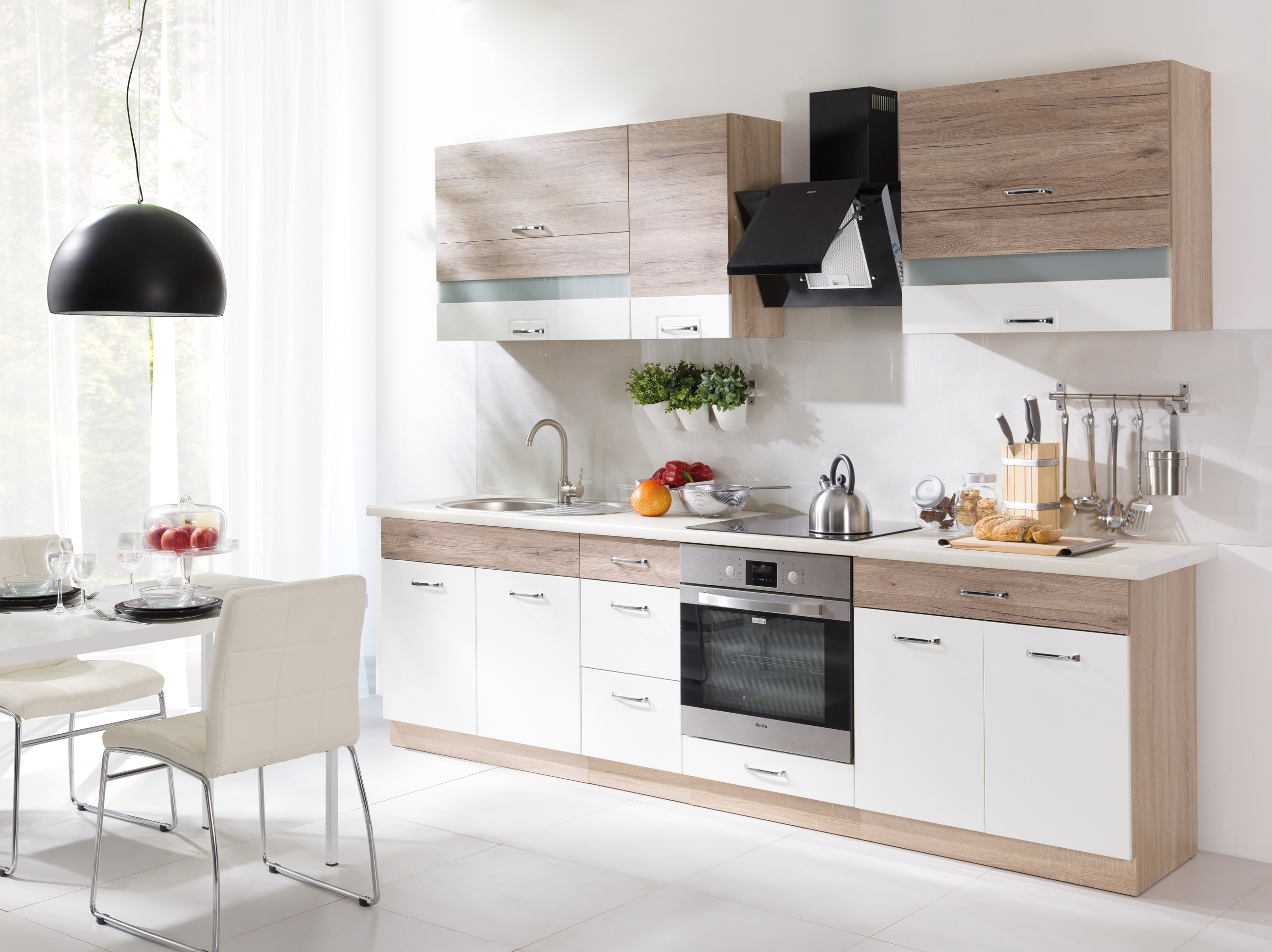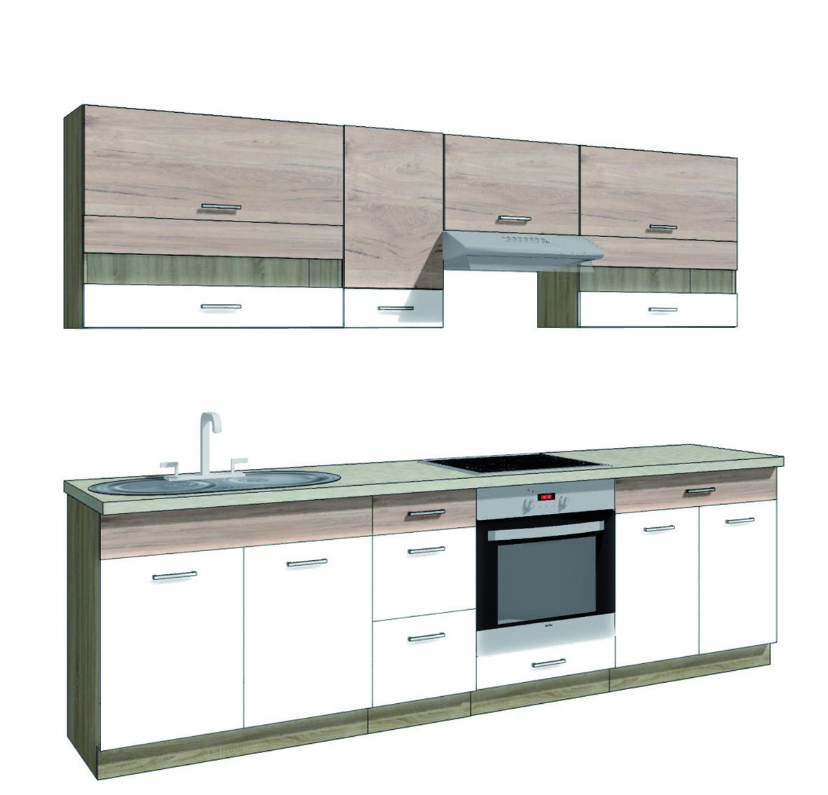 Kuchyňská linka NINA komplet 270cm. Koupě celé sestavy je ekonomičtější než pořízení jednotlivých dílů. Součástí sestavy jsou skříňky, bez kterých se žádná kuchyňská linka neobejde. Kuchyňská linka NINA je vyrobena z kvalitního lamina. Zásuvky u spodních dvířek jsou opatřeny kvalitními pojezdy GTV Metalbox. Dvířka skříňek mají tzv. tiché zavíraní (GTV). Kuchyň má kovové úchyty. Pokud chcete sestavu dle vlastních rozměrů - radi vám poradíme, kontaktujte nás.