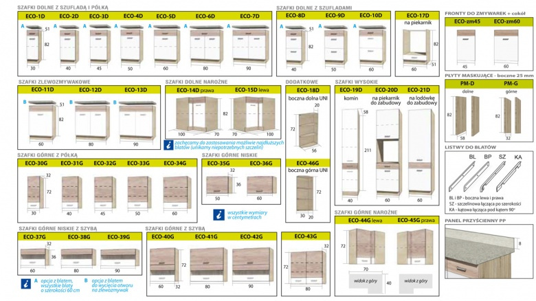 Kuchyňská sestava obsahuje pracovní desku a tyto skříňky: