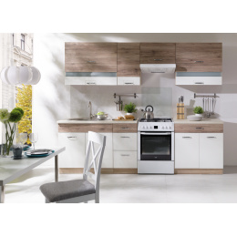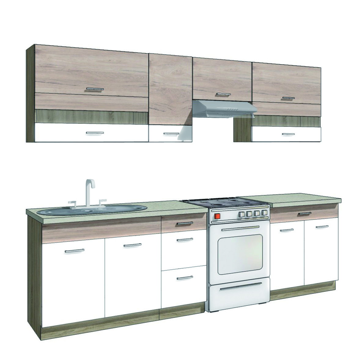Kuchyňská linka NINA komplet 270cm. Koupě celé sestavy je ekonomičtější než pořízení jednotlivých dílů. Součástí sestavy jsou skříňky, bez kterých se žádná kuchyňská linka neobejde. Kuchyňská linka NINA je vyrobena z kvalitního lamina. Zásuvky u spodních dvířek jsou opatřeny kvalitními pojezdy GTV Metalbox. Horní skříňky mají tzv. tiché zavíraní (GTV). Kuchyň má kovové úchyty. Pokud chcete kuchyň sestavit dle vlastních rozměrů - rádi Vám poradíme, kontaktujte nás.