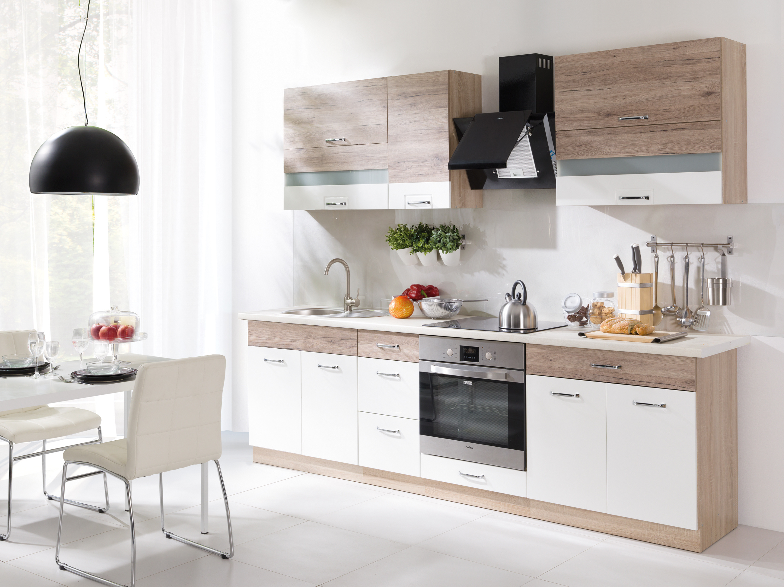 Kuchyňská linka NINA komplet 260cm. Koupě celé sestavy je ekonomičtější než pořízení jednotlivých dílů. Součástí sestavy jsou skříňky, bez kterých se žádná kuchyňská linka neobejde. Kuchyňská linka NINA je vyrobena z kvalitního lamina. Zásuvky u spodních dvířek jsou opatřeny kvalitními pojezdy GTV Metalbox. Horní skříňky mají tzv. tiché zavíraní (GTV). Kuchyň má kovové úchyty. Pokud chcete kuchyň sestavit dle vlastních rozměrů - rádi Vám poradíme, kontaktujte nás.