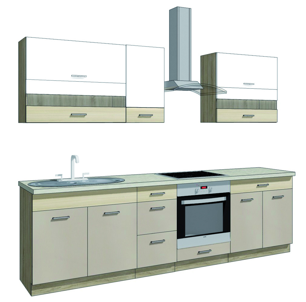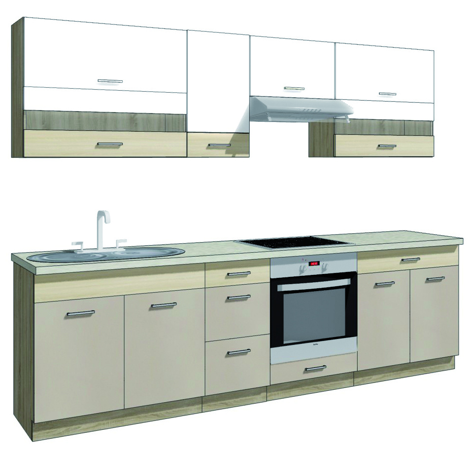 Kuchyňská linka JANA komplet 270cm. Koupě celé sestavy je ekonomičtější než pořízení jednotlivých dílů. Součástí sestavy jsou skříňky, bez kterých se žádná kuchyňská linka neobejde. Kuchyňská linka je vyrobena z kvalitního lamina. Zásuvky u spodních dvířek jsou opatřeny kvalitními pojezdy GTV Metalbox. Dvířka skříněk mají tzv. tiché zavíraní (GTV). Kuchyň JANA má kovové úchyty. Pokud chcete kuchyň sestavit dle vlastních rozměrů - rádi Vám poradíme, kontaktujte nás.