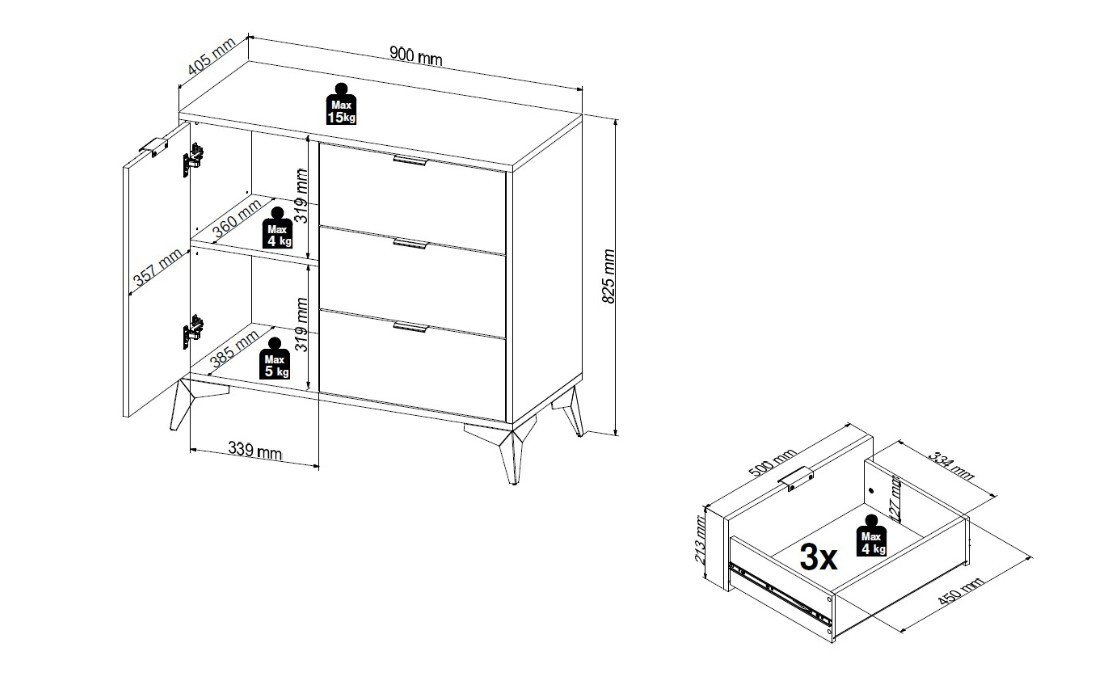 Komoda BIU1D3S ze systému LAMEA - kombinovaná komoda s dvířky za kterými je jedna police a třemi šuplíky