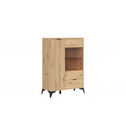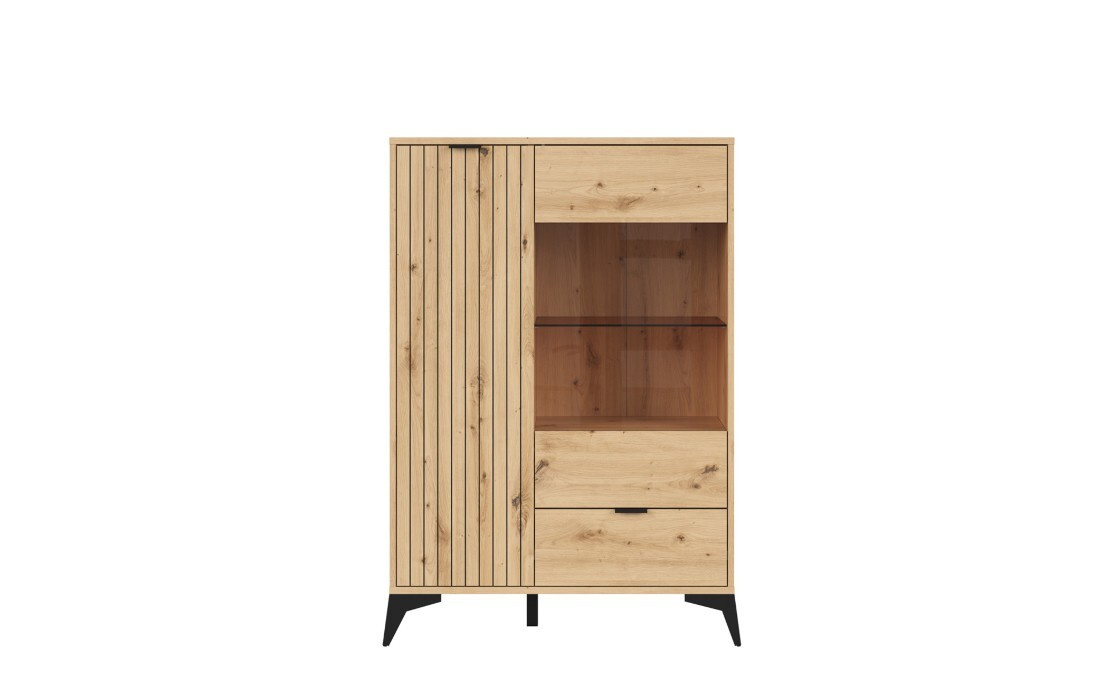 Vitrína REG1D1W1S ze systému LAMEA - plná dvířka za kterými jsou dvě police z lamina, prosklená dvířka s dvěmi policemi z lamina a jednou skleněnou poličkou, ke které můžete dokoupit LED osvětlení za 575 Kč, pod prosklenou části šuplík.