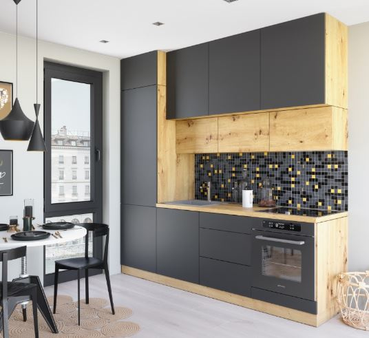 Kuchyňská linka LANGEN 240 - korpus z lamina v dekoru Dub Artisan, dvířka z MDF v dekoru Grey, výklopné skříňky G60KN v dekoru Dub Artisan. Spodní skříňky jsou dodávány bez pracovní desky a soklu, které se objednávají samostatně.