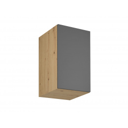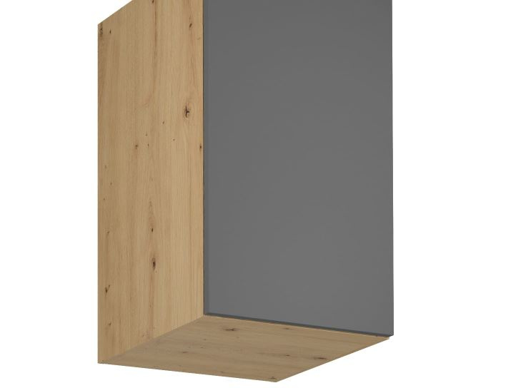Horní skříňka G45G P/L kuchyně LANGEN - jedno dvířková s jednou policí. Dvířka jsou stranově zaměnitelná, můžete je namontovat s pravým nebo levým otevíráním. Korpus lamino v dekoru Dub Artisan, dvířka MDF v dekoru Grey.