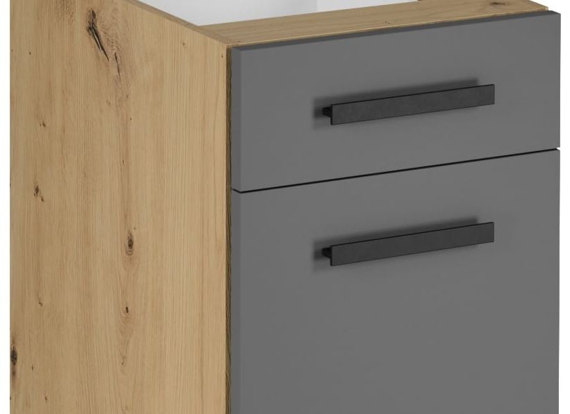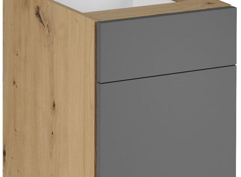 Spodní skříňka D40S1P/L kuchyně LANGEN - jedno dvířková s jednou policí. Dvířka jsou stranově zaměnitelná, můžete je namontovat s pravým nebo levým otevíráním. Korpus lamino v dekoru Dub Artisan, dvířka MDF v dekoru Grey. Výška spodní skříňky je bez pracovní desky.