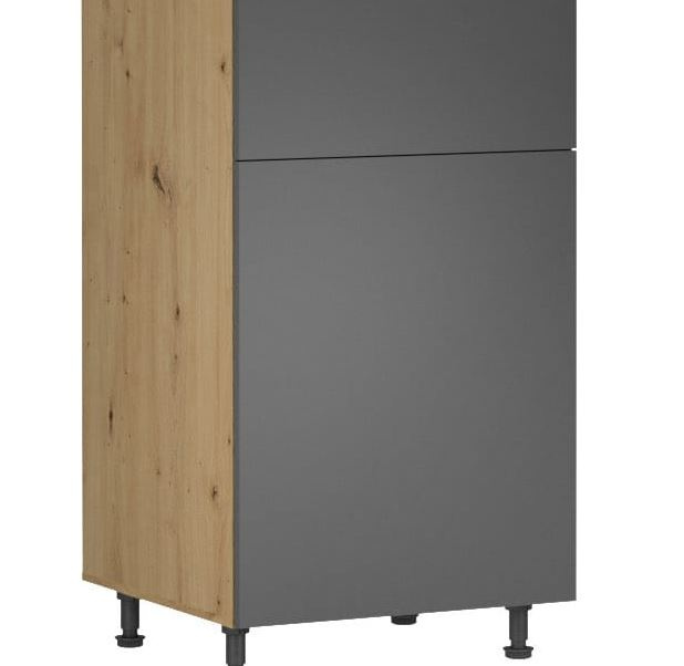 Spodní skříňka D60R P/L kuchyně LANGEN - potravinová, policová skříňka s dvěma dvířky nad sebou. Dvířka jsou stranově zaměnitelná, můžete je namontovat s pravým nebo levým otevíráním. Nad tuto skříňku můžete ještě využít nástavbu N60. Korpus lamino v dekoru Dub Artisan, dvířka MDF v dekoru Grey. Výška spodní skříňky je bez pracovní desky.