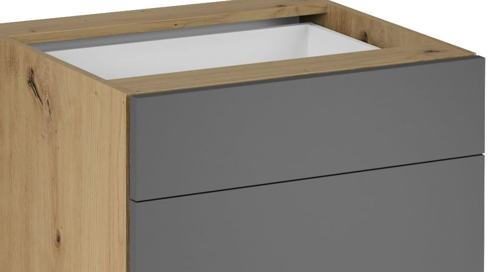 Spodní skříňka D60S1P/L kuchyně LANGEN - jedno dvířková s šuplíkem a s jednou policí. Dvířka jsou stranově zaměnitelná, můžete je namontovat s pravým nebo levým otevíráním. Korpus lamino v dekoru Dub Artisan, dvířka MDF v dekoru Grey. Výška spodní skříňky je bez pracovní desky.