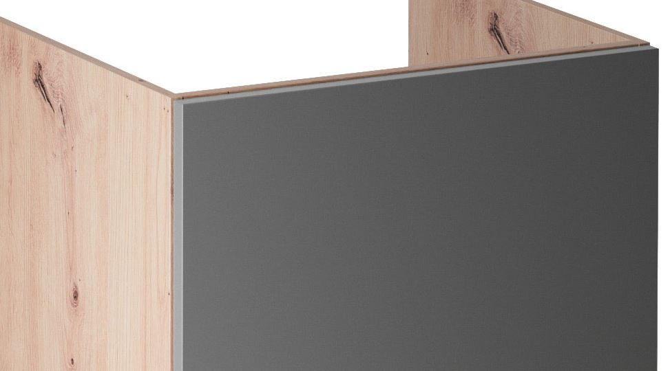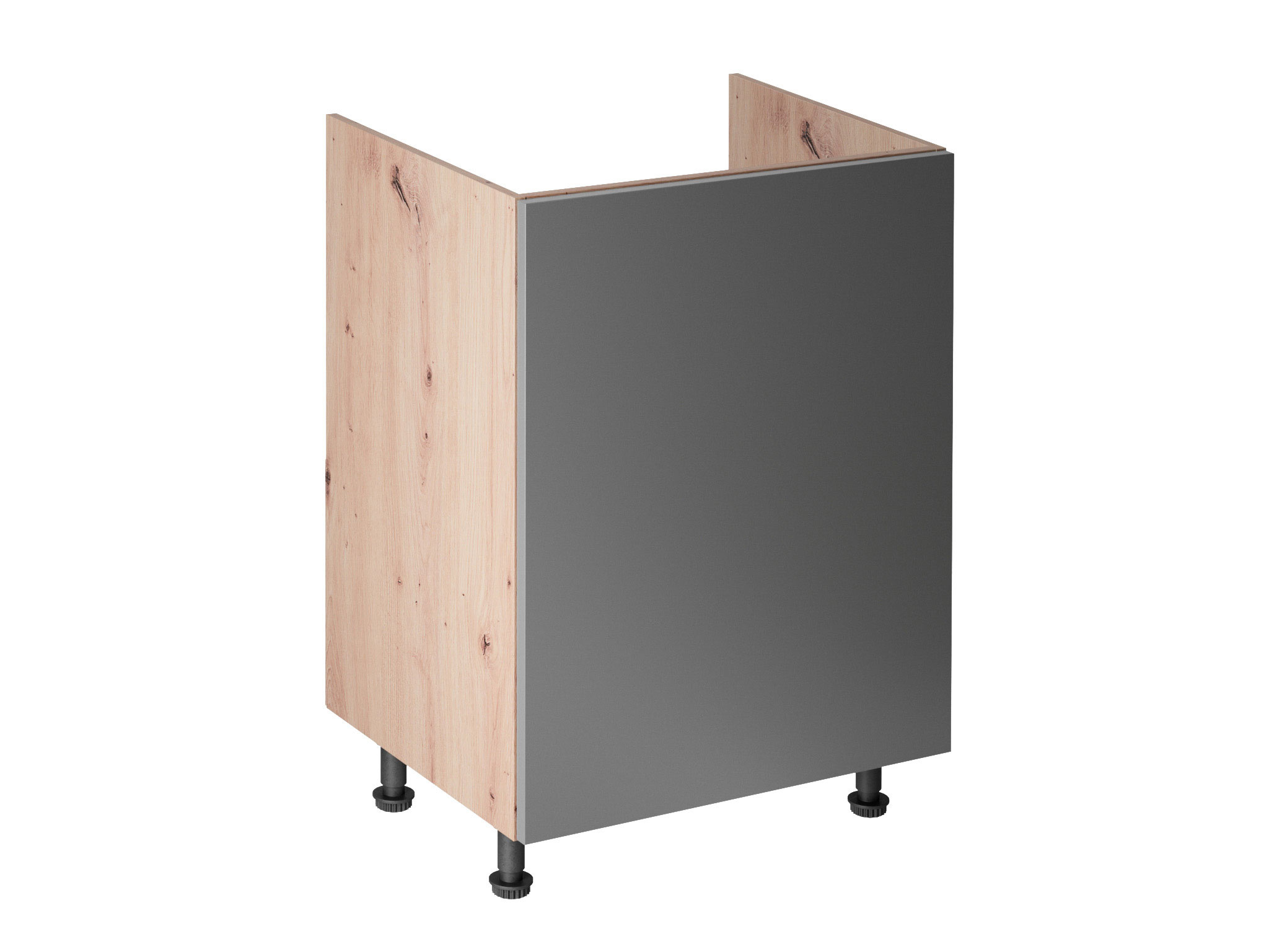 Spodní skříňka D60Z P/L kuchyně LANGEN - dřezova, jedno dvířková bez polic s zadní stěny. Dvířka jsou stranově zaměnitelná, můžete je namontovat s pravým nebo levým otevíráním. Korpus lamino v dekoru Dub Artisan, dvířka MDF v dekoru Grey. Výška spodní skříňky je bez pracovní desky.