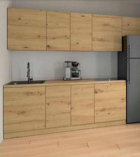 Moderní kuchyňská linky LANGEN pro Vás, kteří si ceníte kvalitního designu a vysoké funkčnosti. Kuchyňské skříňky mají korpus vyroben z kvalitního lamina v dekoru Dub Artisan. Čelní plochy jsou z MDF a můžete si vybrat ze tří barevných provedení Dub Artisan, Grey nebo Beige. Kuchyňské skříňky LANGEN mají šuplíky na kovových pojezdech. Dvířka mohou mít klasický kovový úchyt nebo push to open systém - bezúchytové otevírání. Horní výklopné skříňky mají plynové písty. Kování dvířek jsou s tichým dovíráním a šuplíky s plnovýsuvem bez tichého dovírání. Nožky spodních skříněk jsou výškově stavitelné v rozmezí 10 - 12,5 cm.