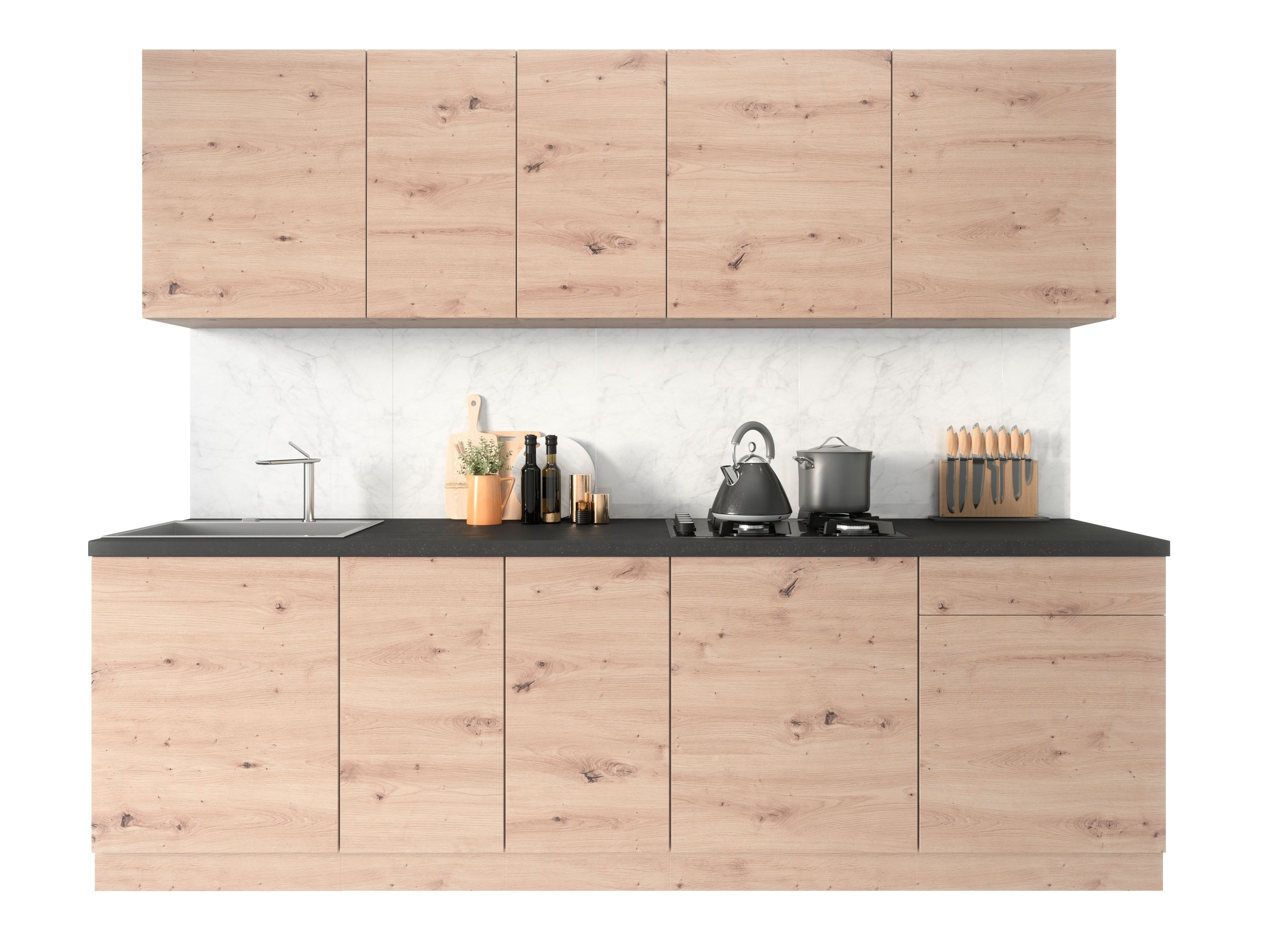 Moderní kuchyňská linky LANGEN pro Vás, kteří si ceníte kvalitního designu a vysoké funkčnosti. Kuchyňské skříňky mají korpus vyroben z kvalitního lamina v dekoru Dub Artisan. Čelní plochy jsou z MDF a můžete si vybrat ze tří barevných provedení Dub Artisan, Grey nebo Beige. Kuchyňské skříňky LANGEN mají šuplíky na kovových pojezdech. Dvířka mohou mít klasický kovový úchyt nebo push to open systém - bezúchytové otevírání. Horní výklopné skříňky mají plynové písty. Kování dvířek jsou s tichým dovíráním a šuplíky s plnovýsuvem bez tichého dovírání. Nožky spodních skříněk jsou výškově stavitelné v rozmezí 10 - 12,5 cm.