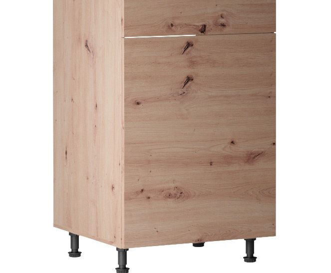 Spodní skříňka D60ZL P/L kuchyně LANGEN - vestavná skříňka pro lednici. Dvířka jsou stranově zaměnitelná, můžete je namontovat s pravým nebo levým otevíráním. Korpus lamino v dekoru Dub Artisan, dvířka MDF v dekoru Dub Artisan. Výška spodní skříňky je bez pracovní desky.