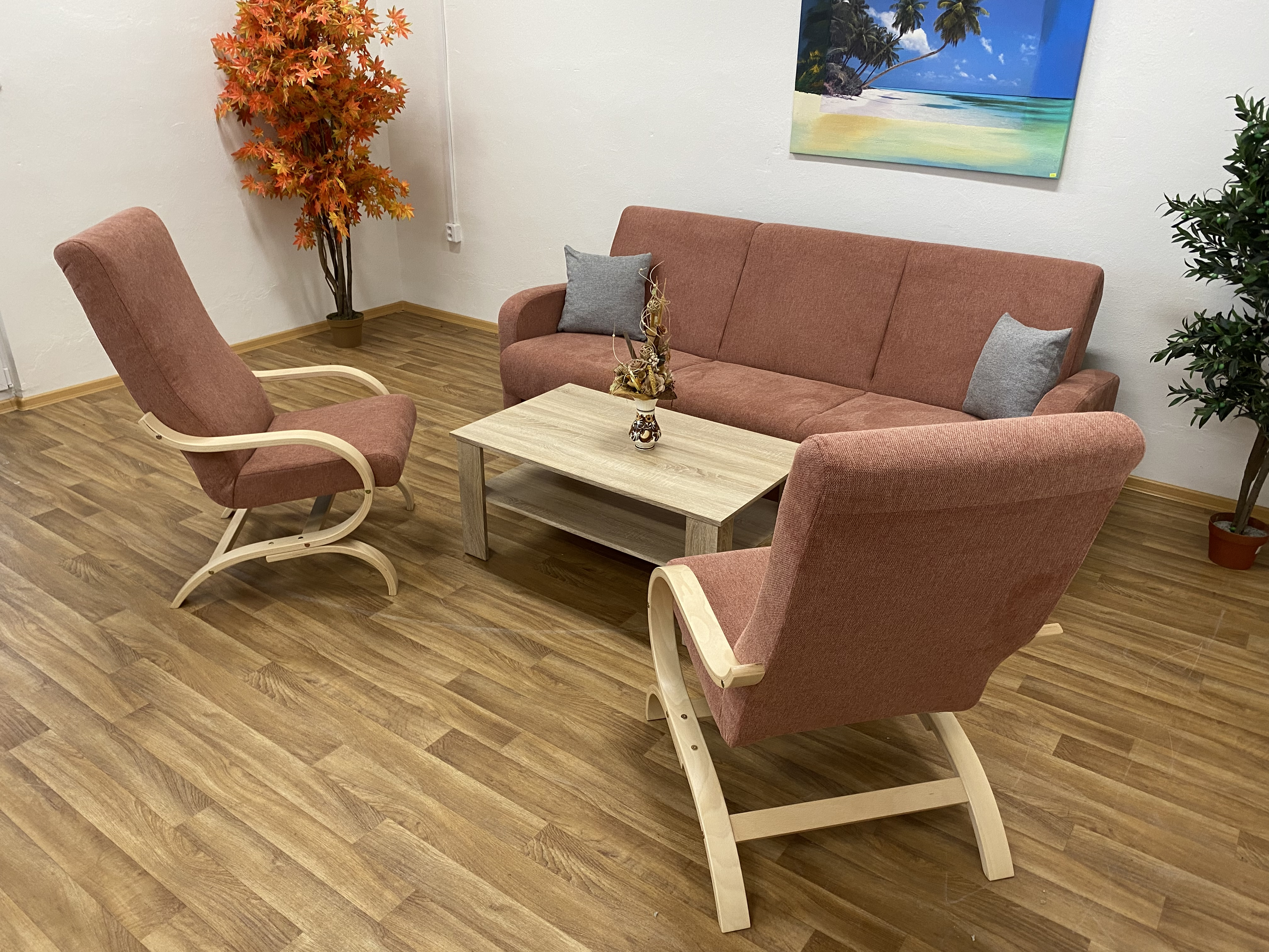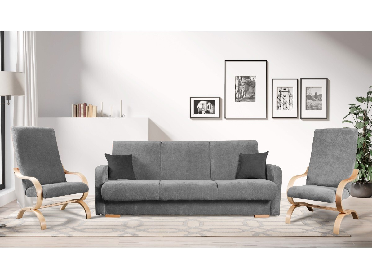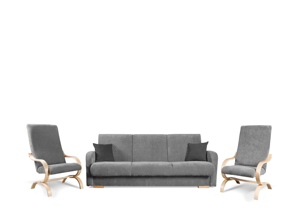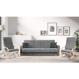 Klasická sedací souprava, která se skládá z rozkládacího trojsedu. Jednoduchým rozkladem vznikne lůžko vhodné k příležitostnému spaní. Trojsed rovněž disponuje úložným prostorem. Součástí sedací soupravy jsou dvě křesla s dřevěnými područkami. Sedací souprava má pružinové jádro v kombinaci s kvalitní PUR pěnou. Sestava je očalouněna látkou v šedé barvě - Matana 03/tmavě šedá - Matana 05. Područky jsou v odstínu přírodní, olše a ořech.