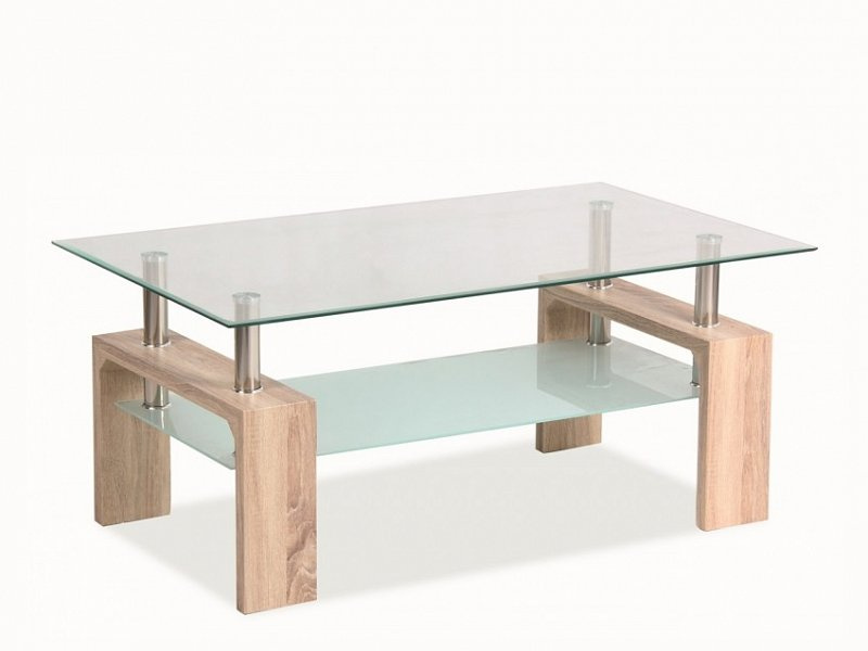 Nohy stolku jsou vyrobeny z MDF v barvě dub sonoma, horní deska je z tvrzeného skla a spodní polička z mléčného skla.