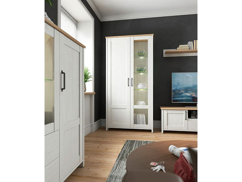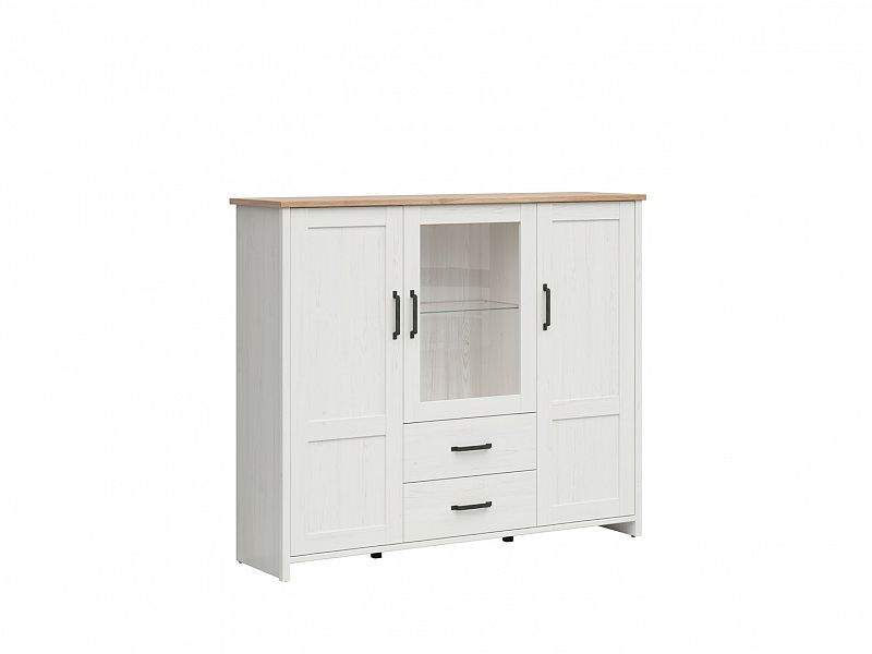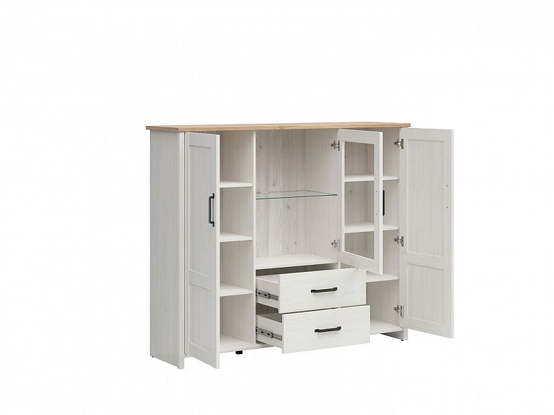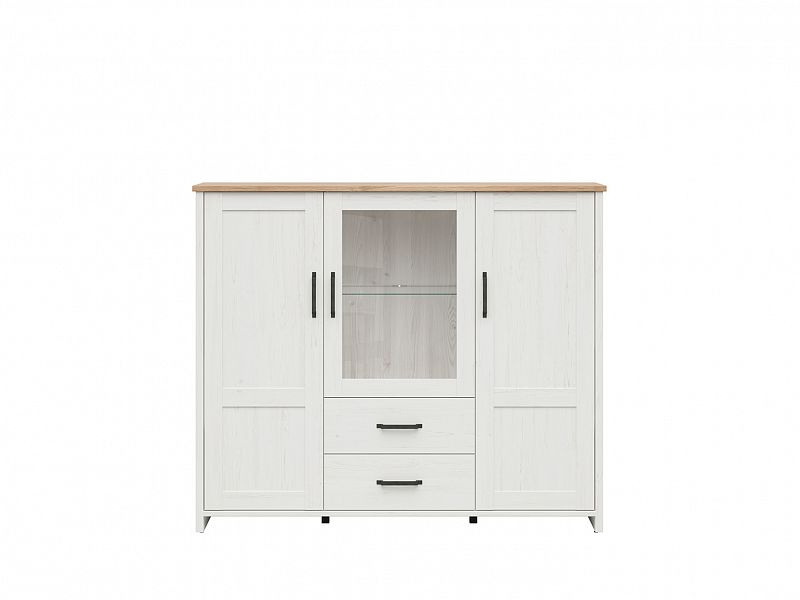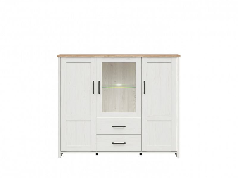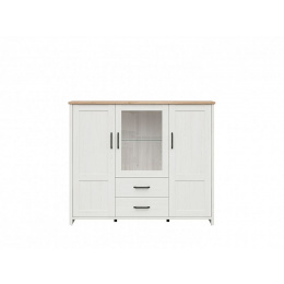 Vitrína LOKSA - rozdělená na plnou a prosklenou část, šuplíky, včetně LED osvětlení v prosklené části