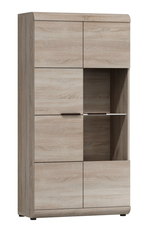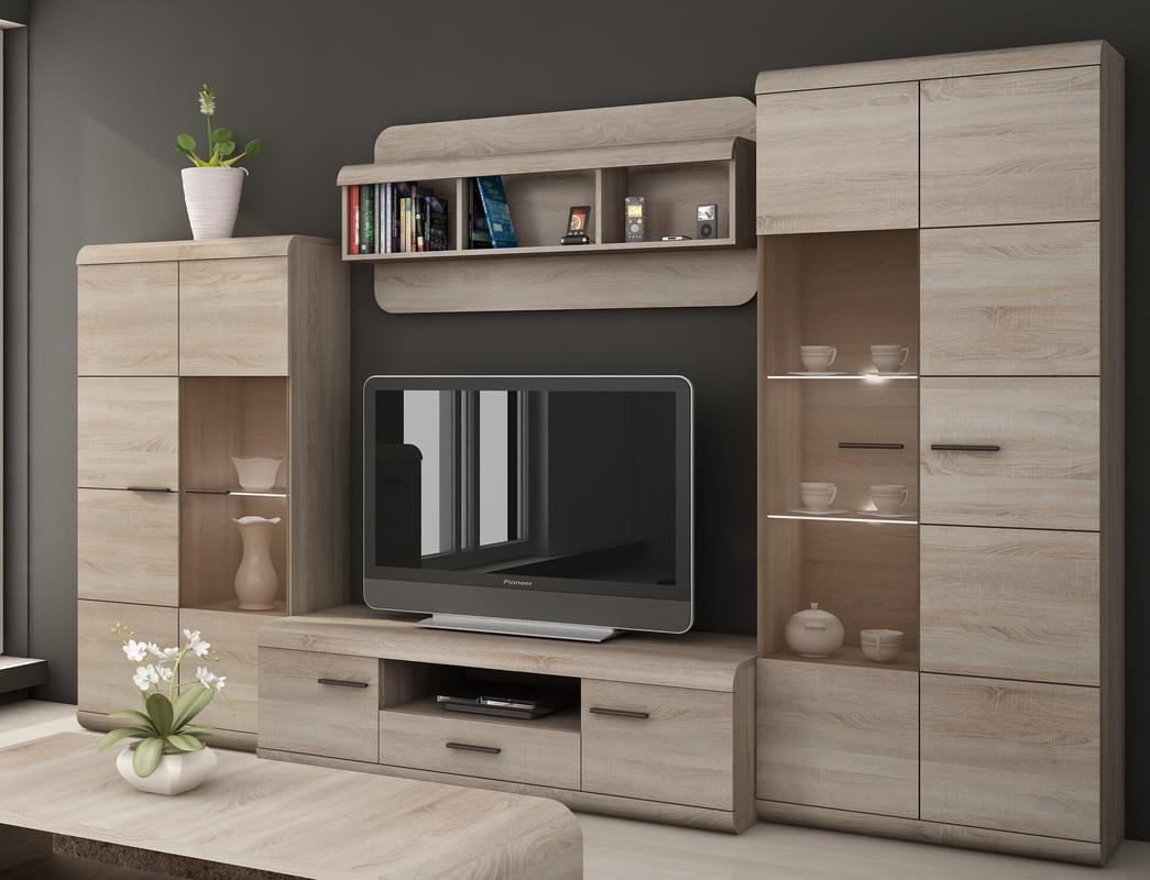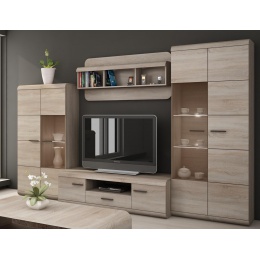 Moderní obývací stěna je vyrobená z kvalitního lamina, zkulacené lišty jsou z MDF, hrany ABS v barevném provedení dub sonoma. Obývací stěnu můžete doplnit nábytkem ze systému LORD. U prosklených vitrín je možno dokoupit LED osvětlení.