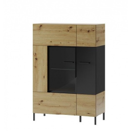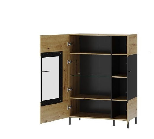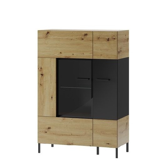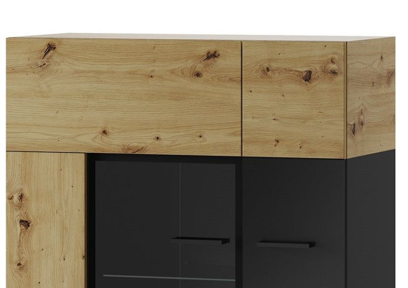 Elegantní spojení kovu a dřevěného dekoru, tím se vyznačuje industriální styl systémového nábytku LUCKY. Tímto originálním nábytkem skvěle zařídíte moderní obývací pokoj. Nosná kostra sektoru LUCKY je vyrobená z kovu v černé barvě. Korpus, dvířka a šuplíky jsou z kvalitního lamina v dekoru dub artisan v kombinaci s černou matnou. Do vitrín lze dokoupit LED osvětlení.