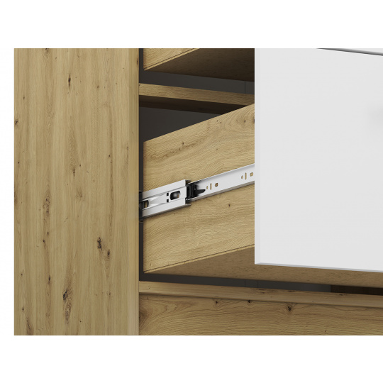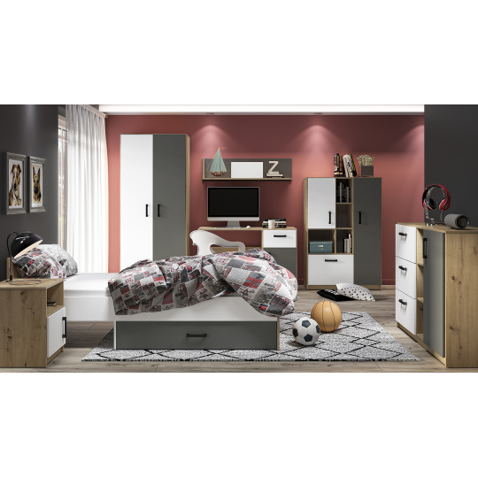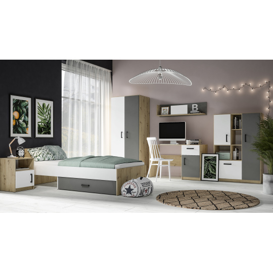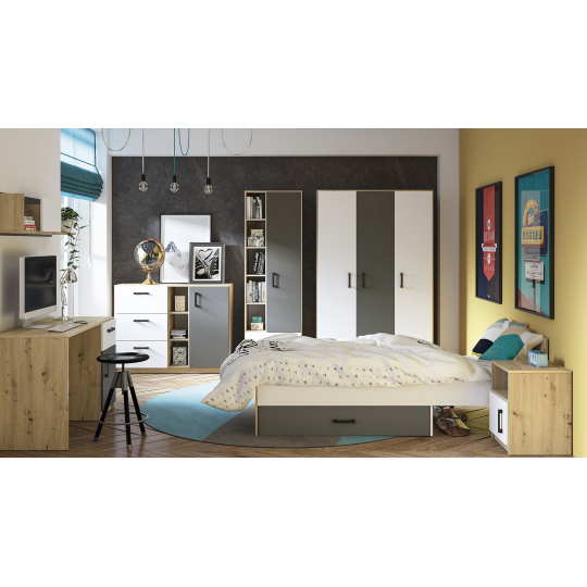 Systémový studentský a dětský nábytek FINI je složen z originálních, jednoduchých tvarů v módních dekorech. Sektor je vyroben z kvalitního lamina. Korpus v dekoru dub artisan je doplněn bílou a antracitem na dvířkách a čelech šuplíků. Barevné ladění čelních ploch a korpusu vytváří mladistvý efekt a eleganci. Kontrastní černé úchytky jsou tečkou na jedinečnosti nábytku FINI.