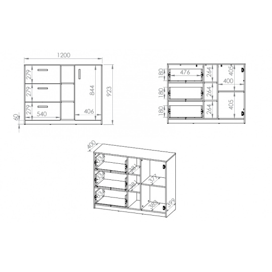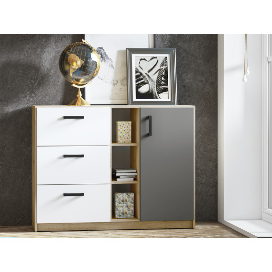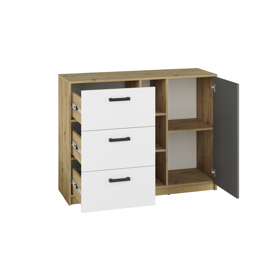 FINI 06 kombinovaná komoda - jednodvířková, policová s otevřenou nikou a s třemi šuplíky