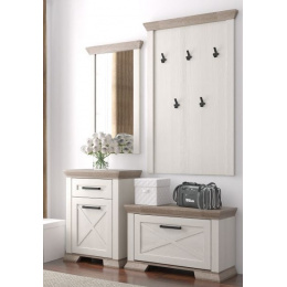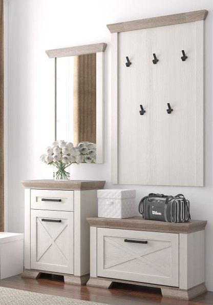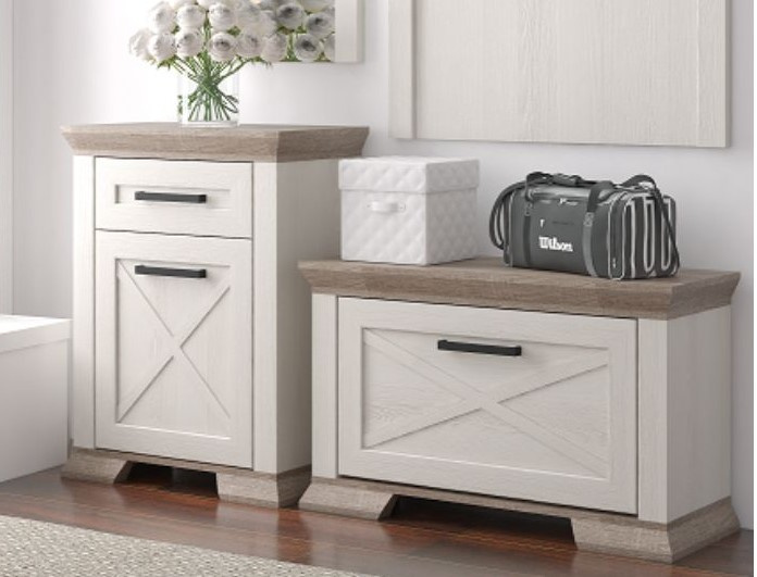 Nábytkový systém LUNA zajistí útulné vybavení vaší předsíně. Vyrábí se v decentním provensálském stylu s výraznou texturou: bříza bílá/dub sonoma tmavý. Nábytek LUNA se vyznačuje masivními korpusy, výraznými nožičkami, ozdobnými lištami na dvířkách a tmavými plochými úchyty, které zdůrazňují geometrickou formu.