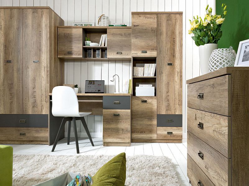 Kolekce nábytku Malcolm se opírá o nejnovější trendy v zařizování pokojů pro děti a studenty. Vyznačuje se moderním provedením dvířek a korpusů s výraznými grafickými akcenty, v barevném provedení: Dub canyon monument s 3D potiskem. Barva dřeva dub canyon monument vytváří zajímavý kontrast s moderní barvou - šedý wolfram.