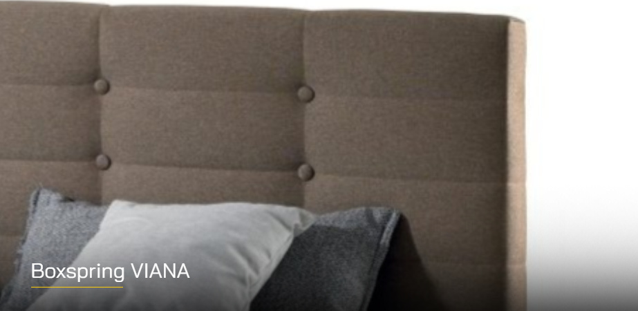 Postel VIANA je z nové modelové řady EXTRA BOXSPRING. Tato řada kontinentálních postelí nabízí maximální komfort a relaxaci. Postele typu BOXSPRING jsou známy především z luxusních hotelů. Postel VIANA má na lamelovém roštu z masivního dřeva začalouněnou pružinovou matraci s vyšší pevností a tvarovou stálostí. Je vzdušná s nadstandartní výškou až 63 cm. Tyto postele mají úložný prostor přístupný z boku postele. Duté vlákno a potahová látka změkčuje rám postele. Úložný prostor dostatečné velikosti s odvětráváním zajišťuje přívod vzduchu k matracím. Vynikající doplněk k této posteli je TOPPER. Je vhodný k ochraně matrace a komfortu spánku. Toto dvoulůžko má lehací plochu 180 × 200 cm nebo 160 x 200 cm. Maximálně pohodlná a praktická postel s komfortní výškou lehací plochy 57- 63 cm (dle výšky noh). Max. zatížení 130kg.