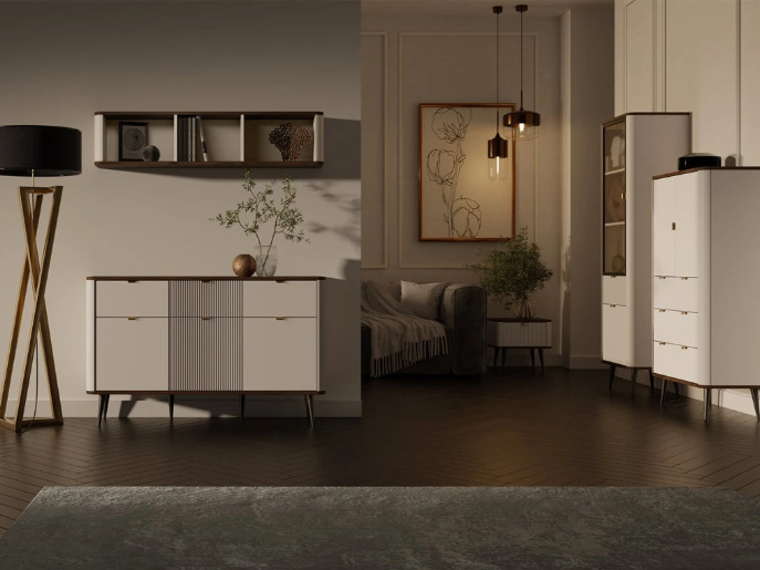 Moderní systémový nábytek MARLY vhodný pro každý interiér. Funkčnost v kombinaci s vysokou estetikou jsou základními vlastnostmi moderního modulárního obývacího nábytku MARLY. Nabízejí širokou škálu designových možností. Dokonale se hodí do různých interiérových designů. Sektor MARLY se vyrábí ve dvou barevných kombinacích. Kašmír / ořech nebo kašmír / šedý kamen, efektní vroubkování čelních ploch a elegance vysokých nožiček vytváří v moderních obývacích pokojích jedinečný styl. S unikátní sestavou obývacího nábytku MARLY můžete dosáhnout požadovaného efektu v interiéru. Sestavu lze snadno přizpůsobit velikosti a uspořádání Vaší místnosti. Tento všestranný modulární nábytek vypadá atraktivně v různých konfiguracích a zajišťuje každodenní pohodlí a odolnost po mnoho let.