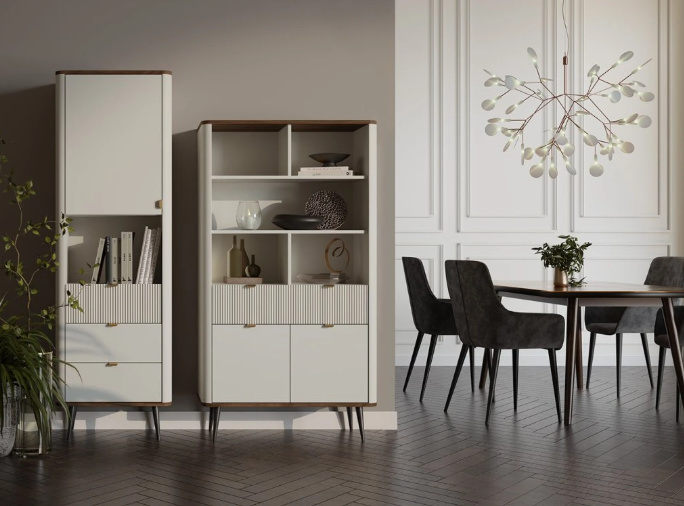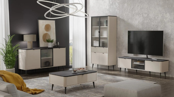 Moderní systémový nábytek MARLY vhodný pro každý interiér. Funkčnost v kombinaci s vysokou estetikou jsou základními vlastnostmi moderního modulárního obývacího nábytku MARLY. Nabízejí širokou škálu designových možností. Dokonale se hodí do různých interiérových designů. Sektor MARLY se vyrábí ve dvou barevných kombinacích. Kašmír / ořech nebo kašmír / šedý kamen, efektní vroubkování čelních ploch a elegance vysokých nožiček vytváří v moderních obývacích pokojích jedinečný styl. S unikátní sestavou obývacího nábytku MARLY můžete dosáhnout požadovaného efektu v interiéru. Sestavu lze snadno přizpůsobit velikosti a uspořádání Vaší místnosti. Tento všestranný modulární nábytek vypadá atraktivně v různých konfiguracích a zajišťuje každodenní pohodlí a odolnost po mnoho let.