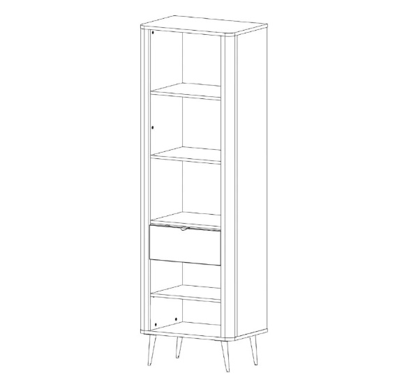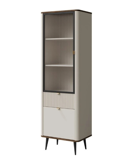 Vitrína 3 ze systému MARLY - ve spodní části plná dvířka a jedna police, uprostřed šuplík, v horní části prosklená dvířka a dvě police