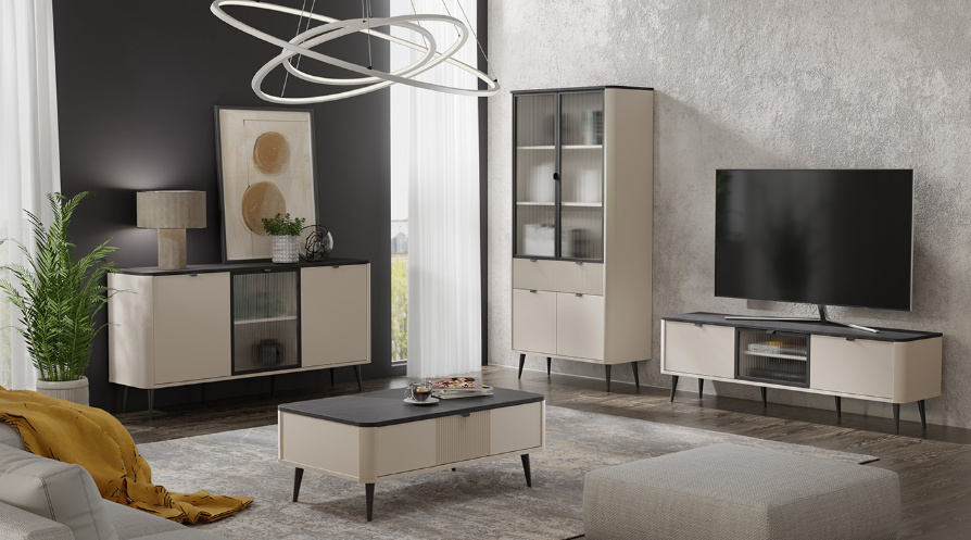 Moderní systémový nábytek MARLY vhodný pro každý interiér. Funkčnost v kombinaci s vysokou estetikou jsou základními vlastnostmi moderního modulárního obývacího nábytku MARLY. Nabízejí širokou škálu designových možností. Dokonale se hodí do různých interiérových designů. Sektor MARLY se vyrábí ve dvou barevných kombinacích. Kašmír / ořech nebo kašmír / šedý kamen, efektní vroubkování čelních ploch a elegance vysokých nožiček vytváří v moderních obývacích pokojích jedinečný styl. S unikátní sestavou obývacího nábytku MARLY můžete dosáhnout požadovaného efektu v interiéru. Sestavu lze snadno přizpůsobit velikosti a uspořádání Vaší místnosti. Tento všestranný modulární nábytek vypadá atraktivně v různých konfiguracích a zajišťuje každodenní pohodlí a odolnost po mnoho let.