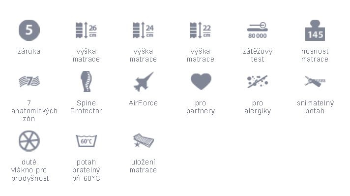 Matrace s unikátním vlnovým jádrem( Spine Protector pro ochranu páteře ). Kombinuje pěny různých tuhostí ve vlnách. Díky tomu má matrace perfektní ortopedické vlastnosti ( rozložení hmotnosti do jádra matrace ). Tužší stranu ( tyrkysová tvoří masivní deska ( 5 cm ) ze studené pěny, která dává matraci tuhost a pružnost. Měkčí strana ( oranžová ) má 7 - zónovou profilaci a provzdušňujícími kanálky, které mění v matraci vzduch s každým pohybem těla ( technologie Air Force ). Střední část, která napodobuje naši páteř je složena z pěn Flexi o různých tuhostech. Matrace se vyrábí ve výšce 22 cm a 26 cm.