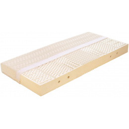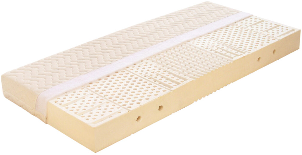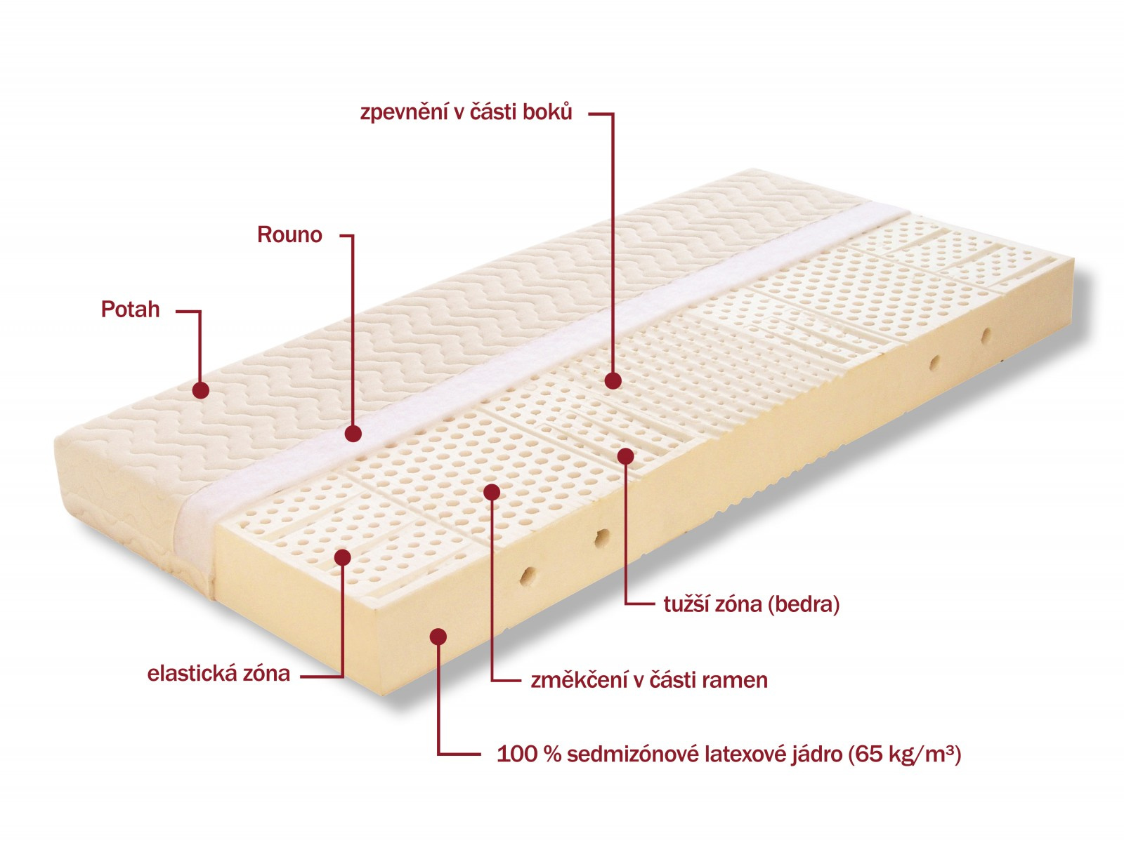 Latexová matrace LADA. Luxusní 100% latexová matrace rozdělená vertikálními otvory do sedmi anatomických zón, které zajišťují optimální podporu každé části těla. Střední část matrace je pevnější, v oblasti ramen a kyčlí naopak měkčí. Latexová matrace LADA se vyznačuje vysokou elasticitou flexibilitou a tvarovou stálostí, díky které si zachová své vlastnosti po řadu let. Vyšší objemová hmotnost jádra matraci řadí k tužším 100% latexovým matracím s označením tvrdosti číslo 2. Díky svým ortopedickým vlastnostem je vhodná pro všechny typy zákazníků, ocení ji hlavně starší populace. Latexová matrace zamezuje tlaku v oblasti kyčlí a kloubů, poskytuje dokonalé uvolnění krční páteře. Matraci je vhodné uložit na všechny typy lamelových roštů.
