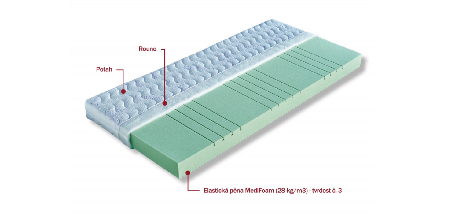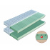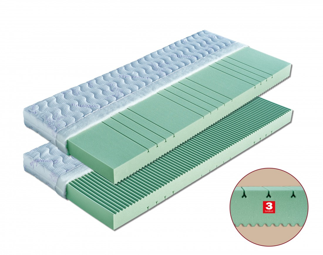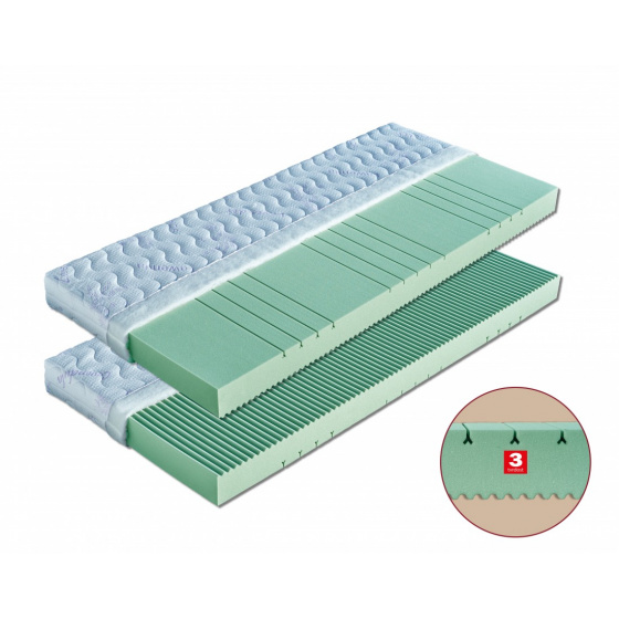 Luxusní matrace, jejíž jádro tvoří 12 cm vysoká vrstva speciální antibakteriální pěny značky Sanitized, která poskytuje trvalou a účinnou ochranu proti bakteriím, roztočům a plísním. Tyto vlastnosti ocení nejen alergici, ale i ti, kteří kladou důraz na vysokou hygienu lůžka. Je navržena se zářezy ve tvaru „Y“, které napomáhají odlehčení v místech největšího zatížení - oblast ramen. Vrchní stranu matrace změkčuje oblíbená visco-elastická pěna. Je charakteristická efektem pomalého vracení se do původní polohy. Pouhým přetočením matrace získáte pevnější stranu se vzdušnou a elastickou studenou (HR) pěnou, která má antidekubitní prořezy v pěti zónách. Dokonale se přizpůsobí ležícímu tělu a zamezuje vzniku proleženin. Matrace je vhodná na všechny typy roštů, včetně motorových.