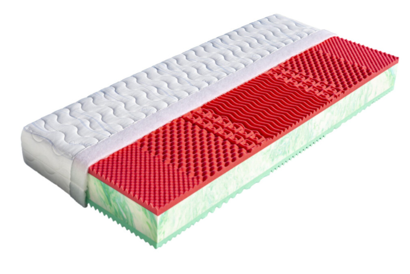 Jádra těchto matrací jsou tvořena pěnou MediFoam (32 kg/m³), která má skvělé podpůrné vlastnosti. Červená ložná plocha je tvořena antibakteriální pěnou tvarovanou do masážních nopů s úpravou Sanitized (32 kg/m³). Jsou vhodné nejen pro alergiky. Jejich druhá strana je tvořena pěnou MediFoam (35 kg/m³), která je taktéž tvarovaná do nopů. Tuto matraci vyrábíme ve třech výškách. Je vhodná pro všechny typy roštů.