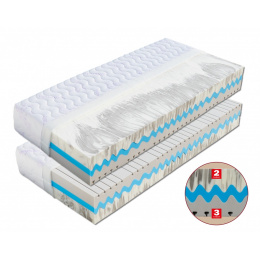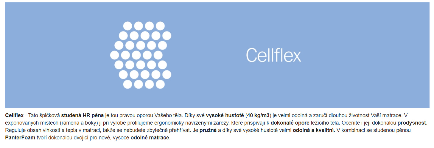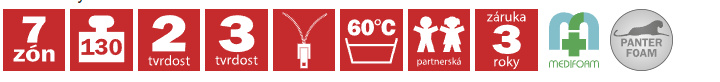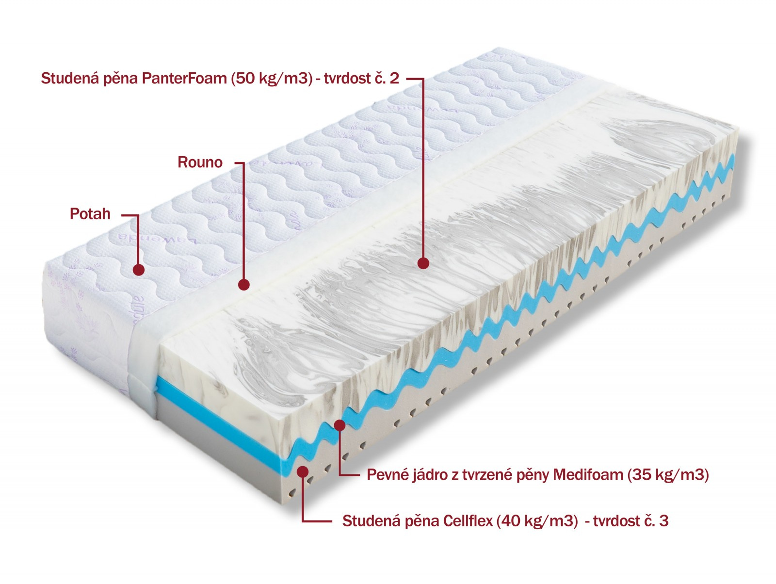 Matrace s komfortní výškou 25 cm, která vyniká svojí odolností a dlouhou životností. Poddajnější stranu matrace tvoří pěna PanterFoam (50 kg/m³), která přináší to nejlepší pro Váš spánek. Hlavní předností této pěny je její výjimečná elasticita a skvělá prodyšnost. Je velmi pohodlná a její vlastnosti jsou stálé i po mnoha letech užívání. Její vyšší hustota zaručí nadstandardní odolnost. Střed jádra matrace je vyztužen tvrzenou pěnou MediFoam (35 kg/m³) v důmyslném vlnkovitém tvaru, díky kterému se matrace dokonale přizpůsobí křivkám Vašeho těla. Druhou, pevnější stranu matrace s ventilačními průřezy tvoří špičková pěna Cellflex (40 kg/m³), která je tou pravou podporou těla. Reguluje obsah vlhkosti a tepla v matraci, je pružná a díky své vysoké hustotě velmi odolná. Má jemnou otevřenou buněčnou strukturu, která zajišťuje vynikající rozložení tlaku na matraci. Matrace je vhodná pro všechny typy roštů.
