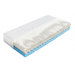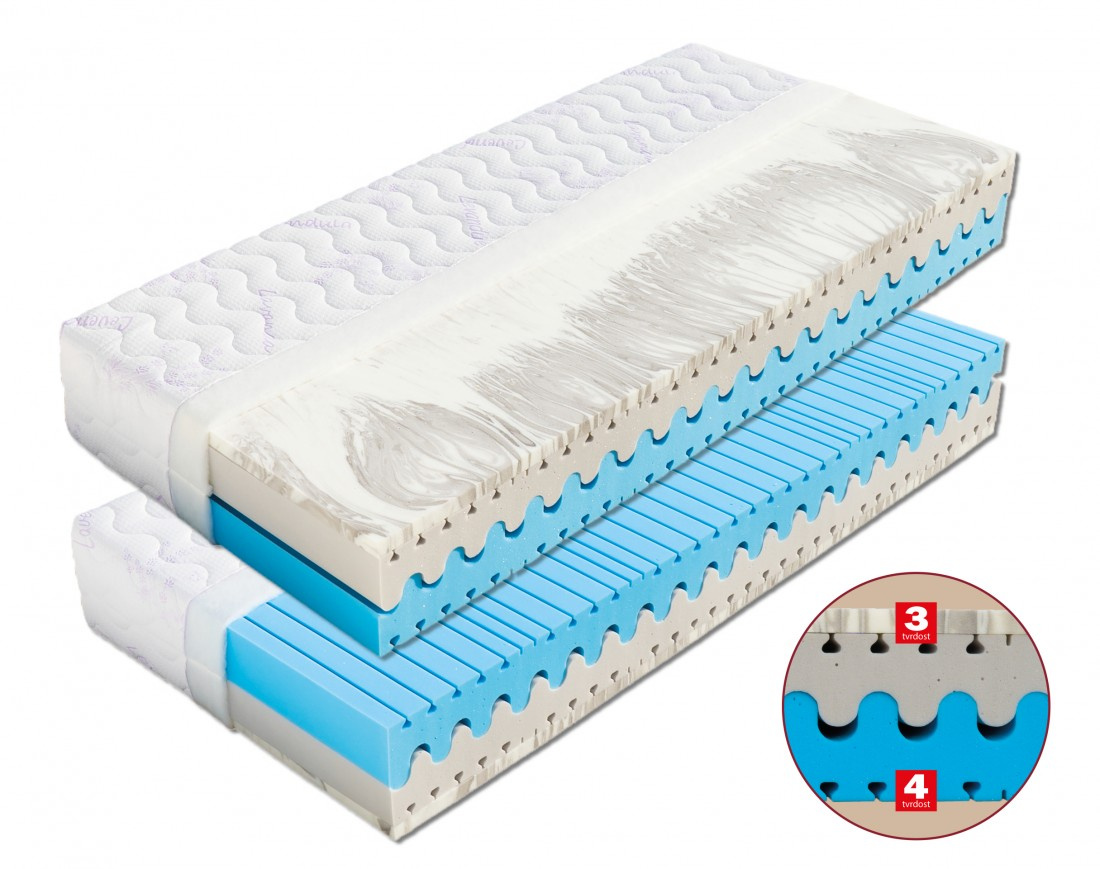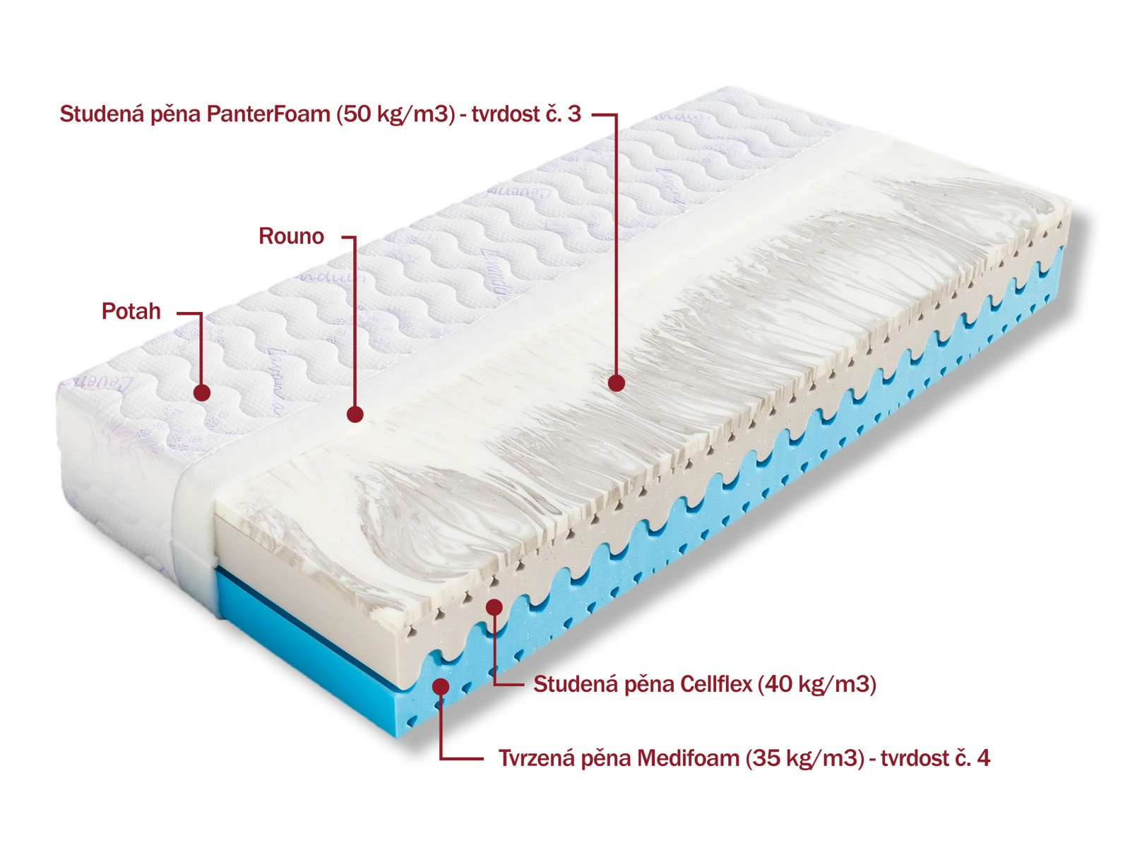 Pevnější matrace se špičkovou studenou pěnou Cellflex, která je díky vysoké hustotě (40 kg/m3) velmi odolná a zaručí dlouhou životnost Vaší matrace. Její zářezy v exponovaných místech přispívají k dokonalé opoře ležícího těla (pod rameny a boky se více prohne a odpruží). Pěna Cellflex je doplněna poddajnější studenou pěnou PanterFoam, která je velmi vzdušná a elastická, proto tvoří měkčí stranu této matrace (tvrdost č. 3). Naproti tomu pevnější strana (tvrdost č. 4) je tvořena vysoce gramážní pěnou MediFoam, která i při vyšší hustotě optimalizuje rozložení tlaku na matraci. I na jejím povrchu najdete speciální zářezy. Jádro matrace je provzdušněné vlnkovitým prořezem důležitým pro větší prodyšnost matrace a dokonalou spolupráci obou pěn. Matrace je vhodná na všechny typy roštů, ale i na pevnou desku. Matrace HELENA je 7 zónová.
